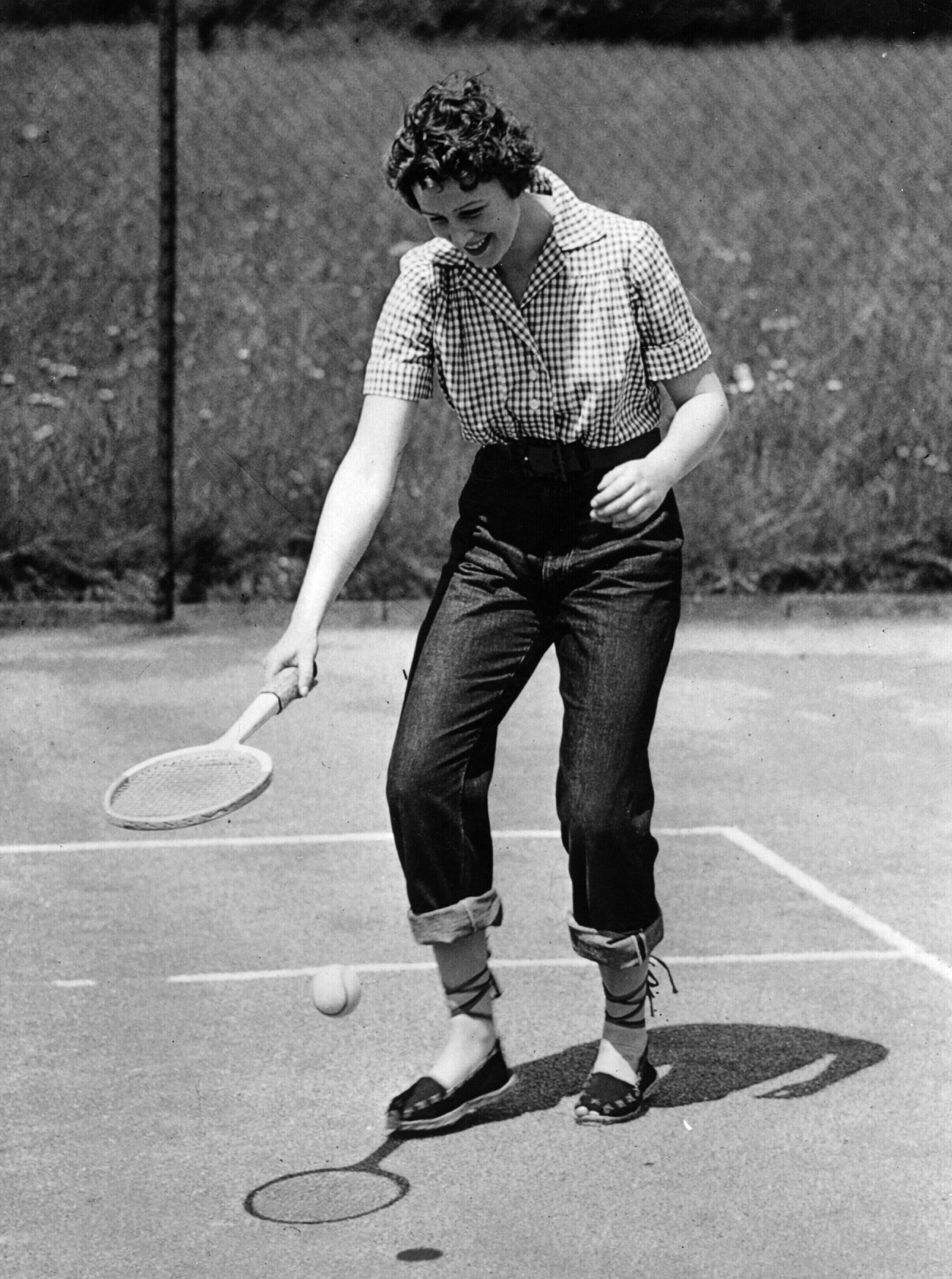 21 Αυγούστου 1954: Η πριγκίπισσα Αλεξάνδρα του Kent παίζει τένις με σκουρόχρωμο boxy τζιν. (Getty Images)