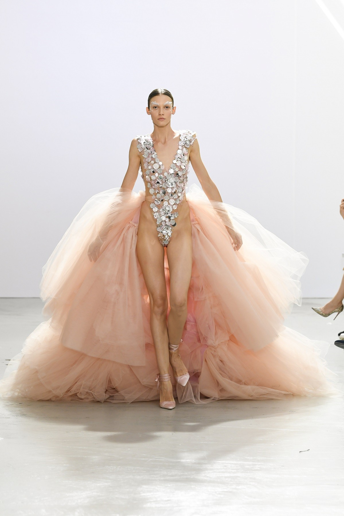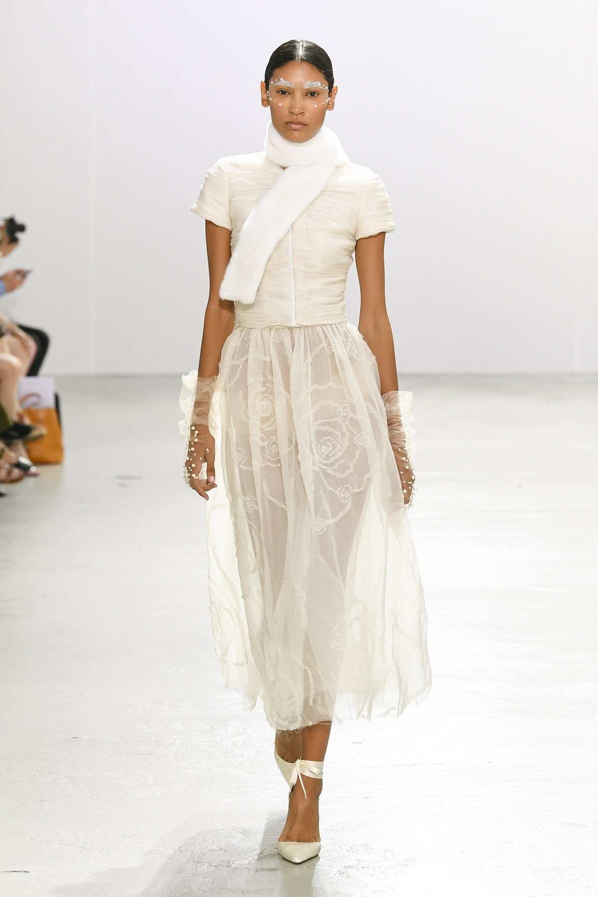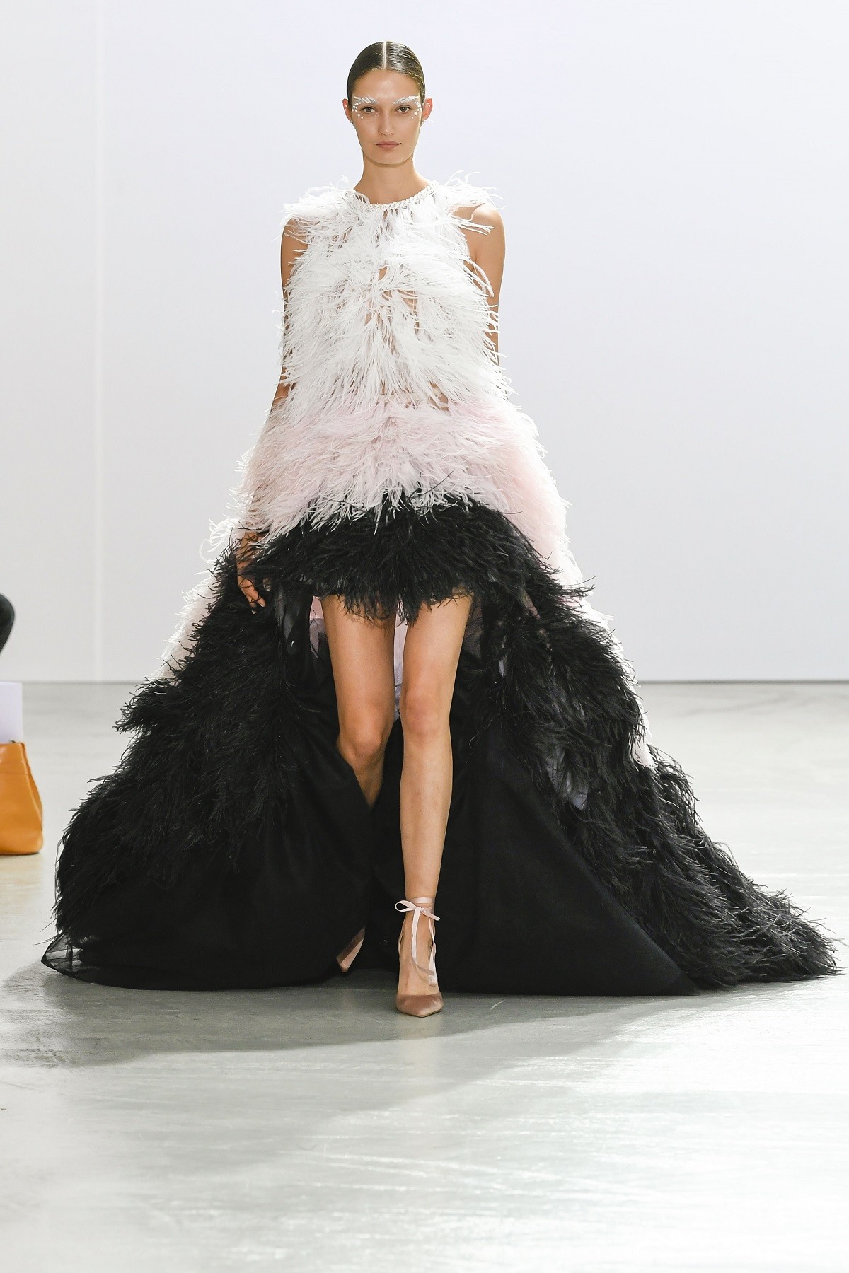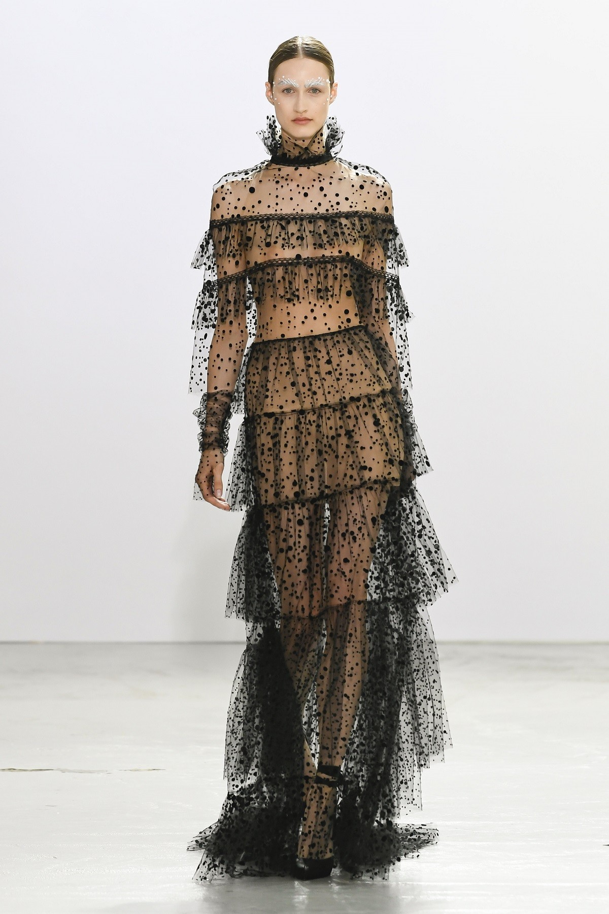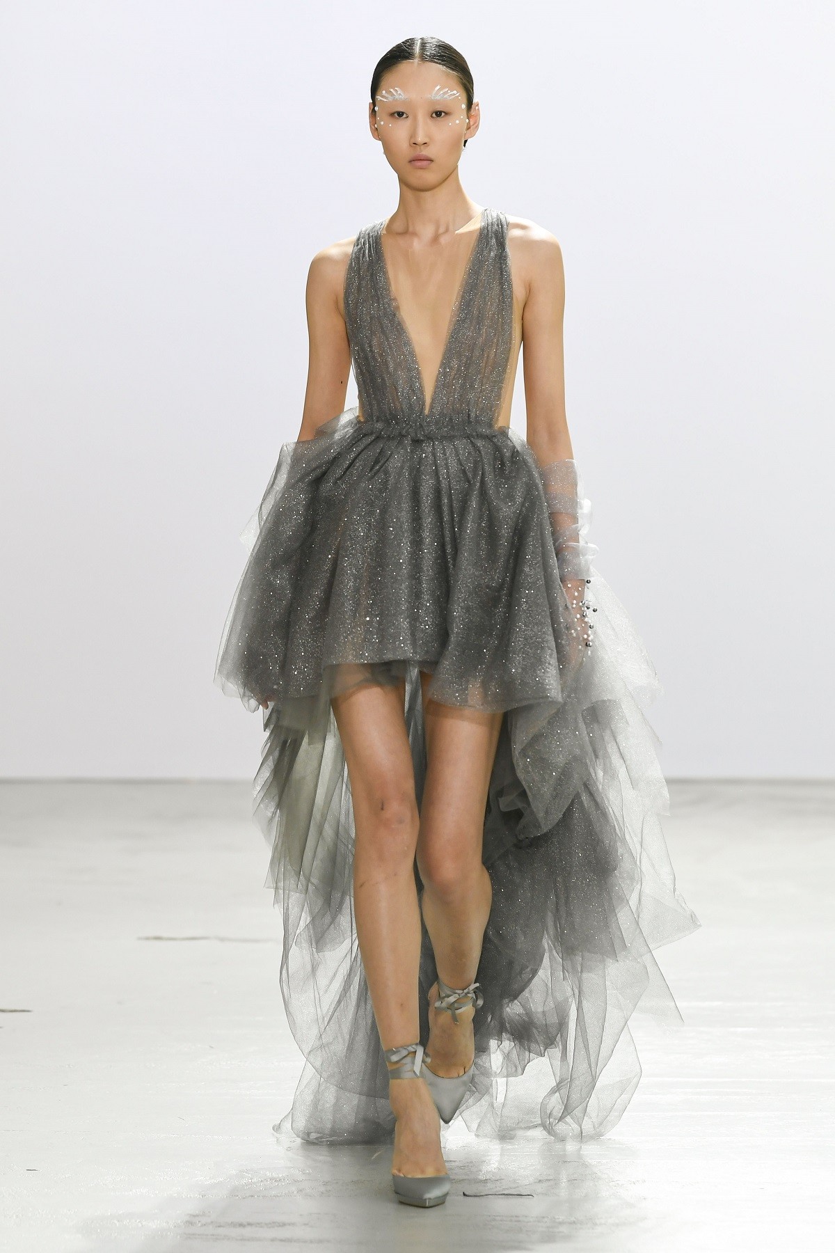 Ολοκέντητες δημιουργίες σε nude, γκρι και μαύρο, αιθέριες full skirts κεντημένες με πέρλες και φορέματα από τούλι, οργάντζα, βελούδο και μεταξωτή δαντέλα σε μια συλλογή βγαλμένη από όνειρο. Τα φτερά, ένα από τα αγαπημένα υλικά της σχεδιάστριας, δεν θα μπορούσαν να λείπουν από τη συλλογή A/W 2019-2020, δίνοντας στις δημιουργίες που μοιάζουν με γλυπτά μια αέρινη κίνηση.
