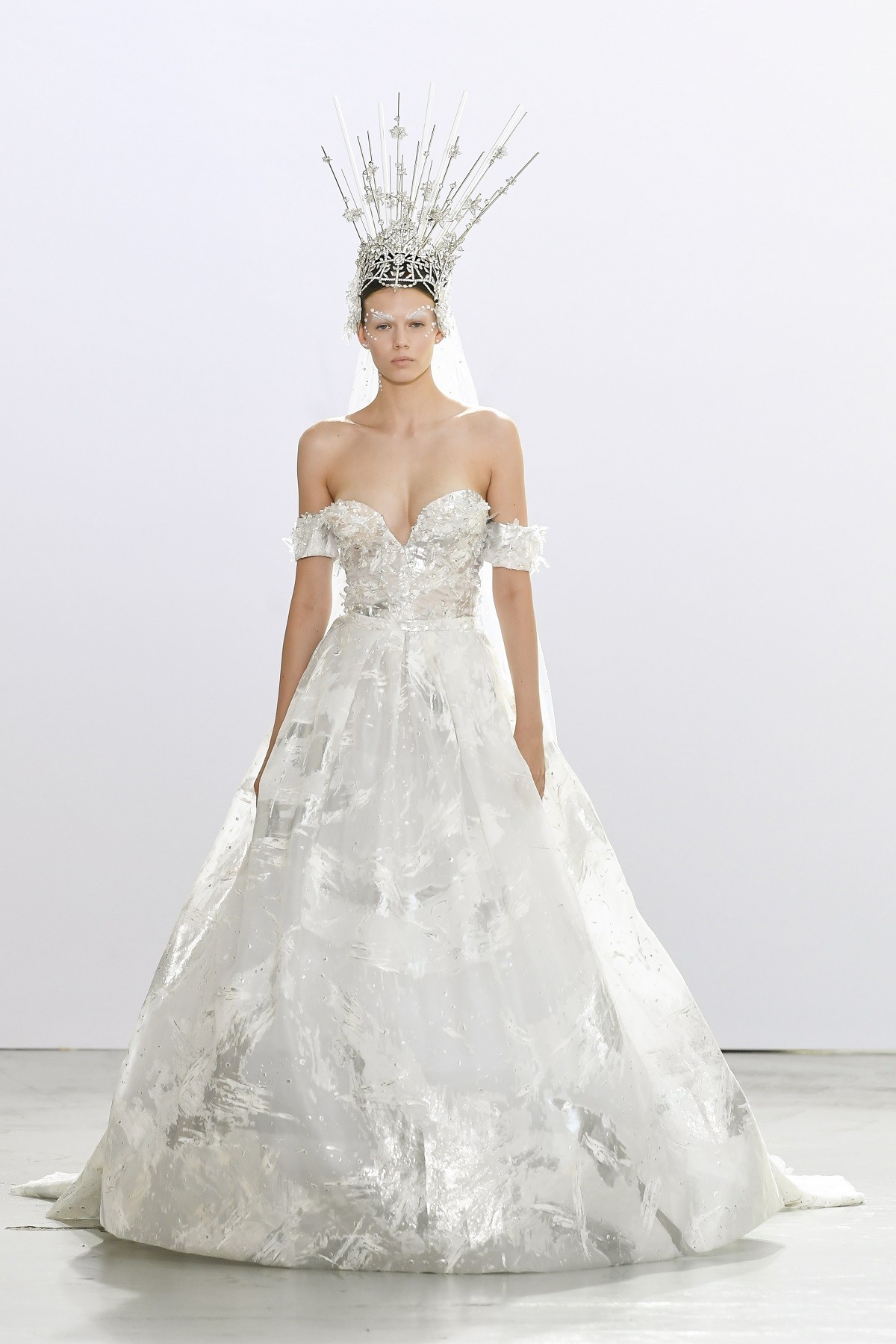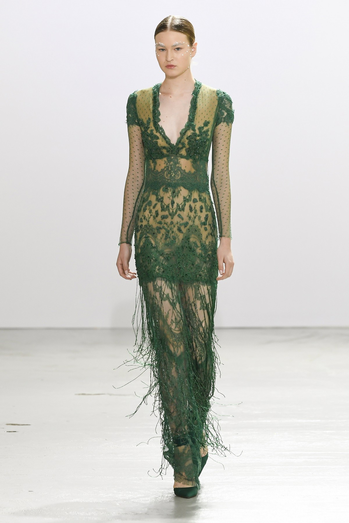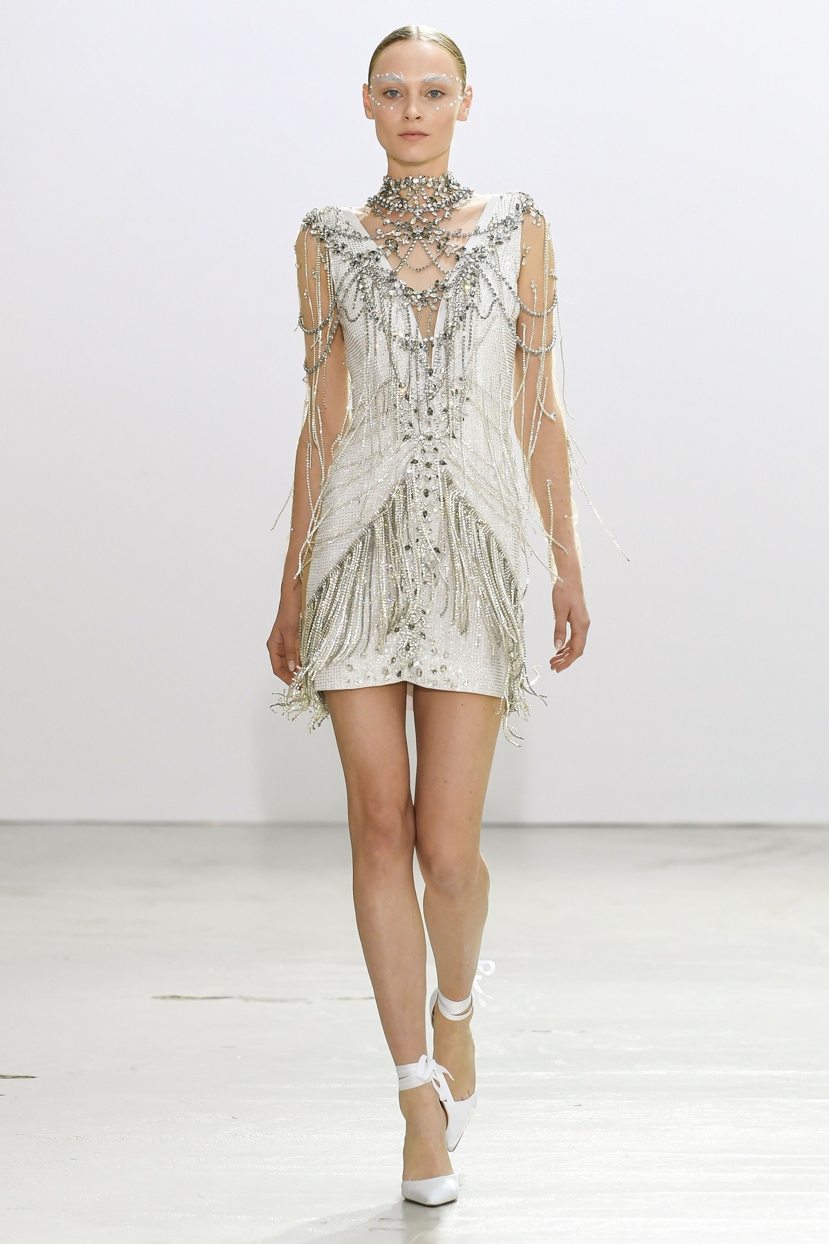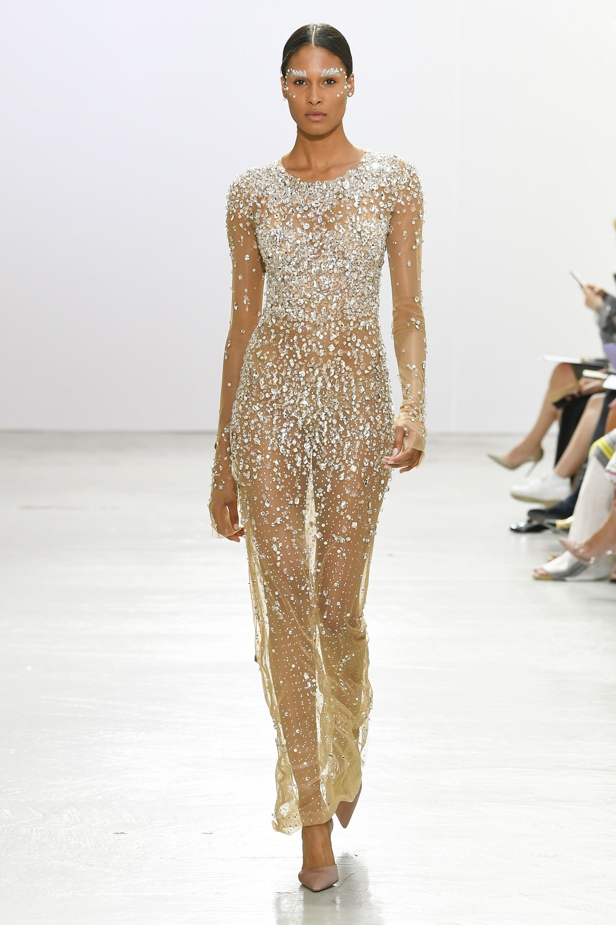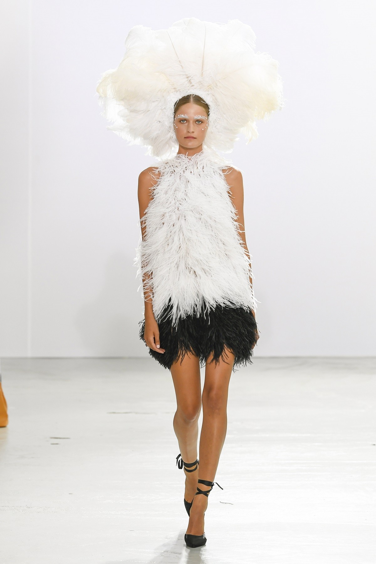 Ολοκέντητες δημιουργίες σε nude, γκρι και μαύρο, αιθέριες full skirts κεντημένες με πέρλες και φορέματα από τούλι, οργάντζα, βελούδο και μεταξωτή δαντέλα σε μια συλλογή βγαλμένη από όνειρο. Τα φτερά, ένα από τα αγαπημένα υλικά της σχεδιάστριας, δεν θα μπορούσαν να λείπουν από τη συλλογή A/W 2019-2020, δίνοντας στις δημιουργίες που μοιάζουν με γλυπτά μια αέρινη κίνηση.