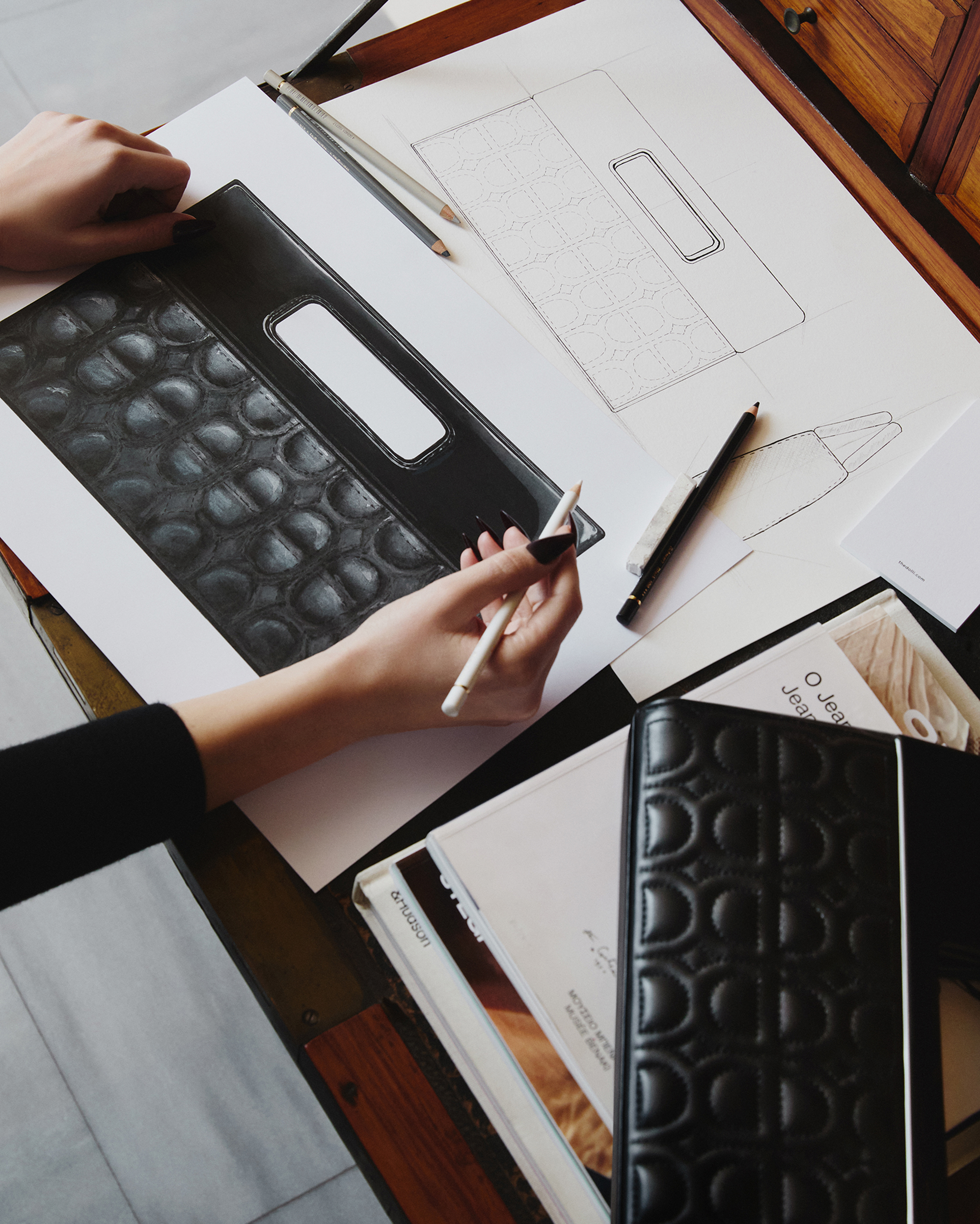 Ένα γυαλιστερό plexiglass χερούλι, στιβαρό και αρχιτεκτονικό, συνδυάζεται με ένα απαλό, καπιτονέ σώμα από nappa δέρμα, όπου το μονόγραμμα του ξενοδοχείου THE DOLLI αποτυπώνεται ως ανάγλυφο γεωμετρικό μοτίβο, εμπνευσμένο από τη νεοκλασική πρόσοψη και τα ασπρόμαυρα μαρμάρινα δάπεδα του ξενοδοχείου.