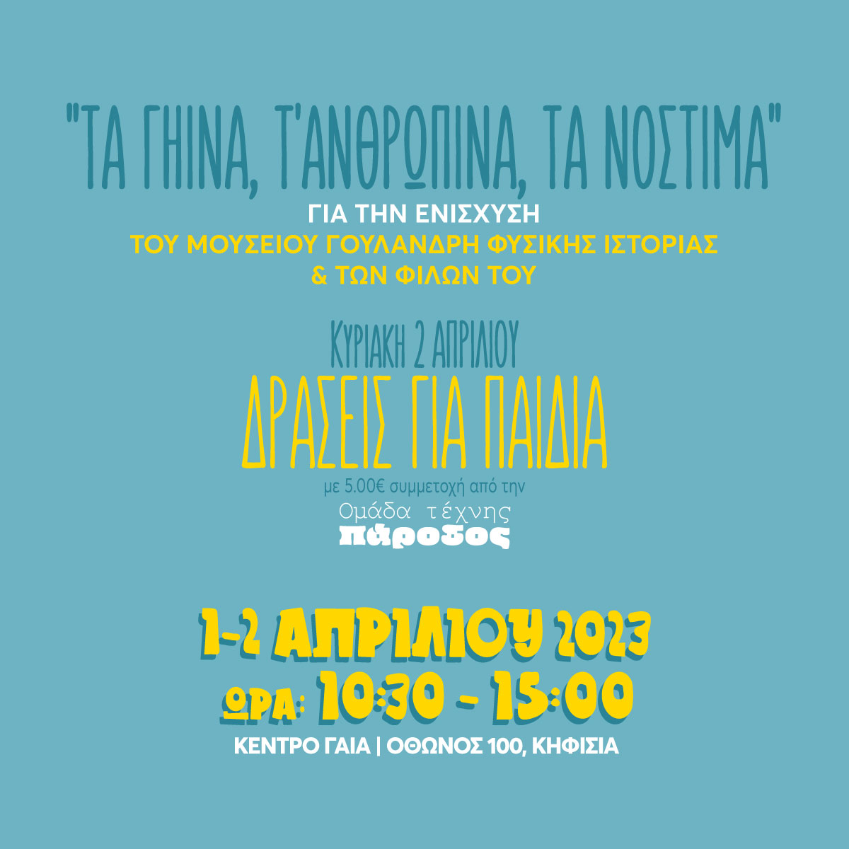 Σαββατοκύριακο 1 και 2 Απριλίου 2023, ώρα 10:30 -15:00, Κέντρο ΓΑΙΑ, Όθωνος 100, Κηφισιά