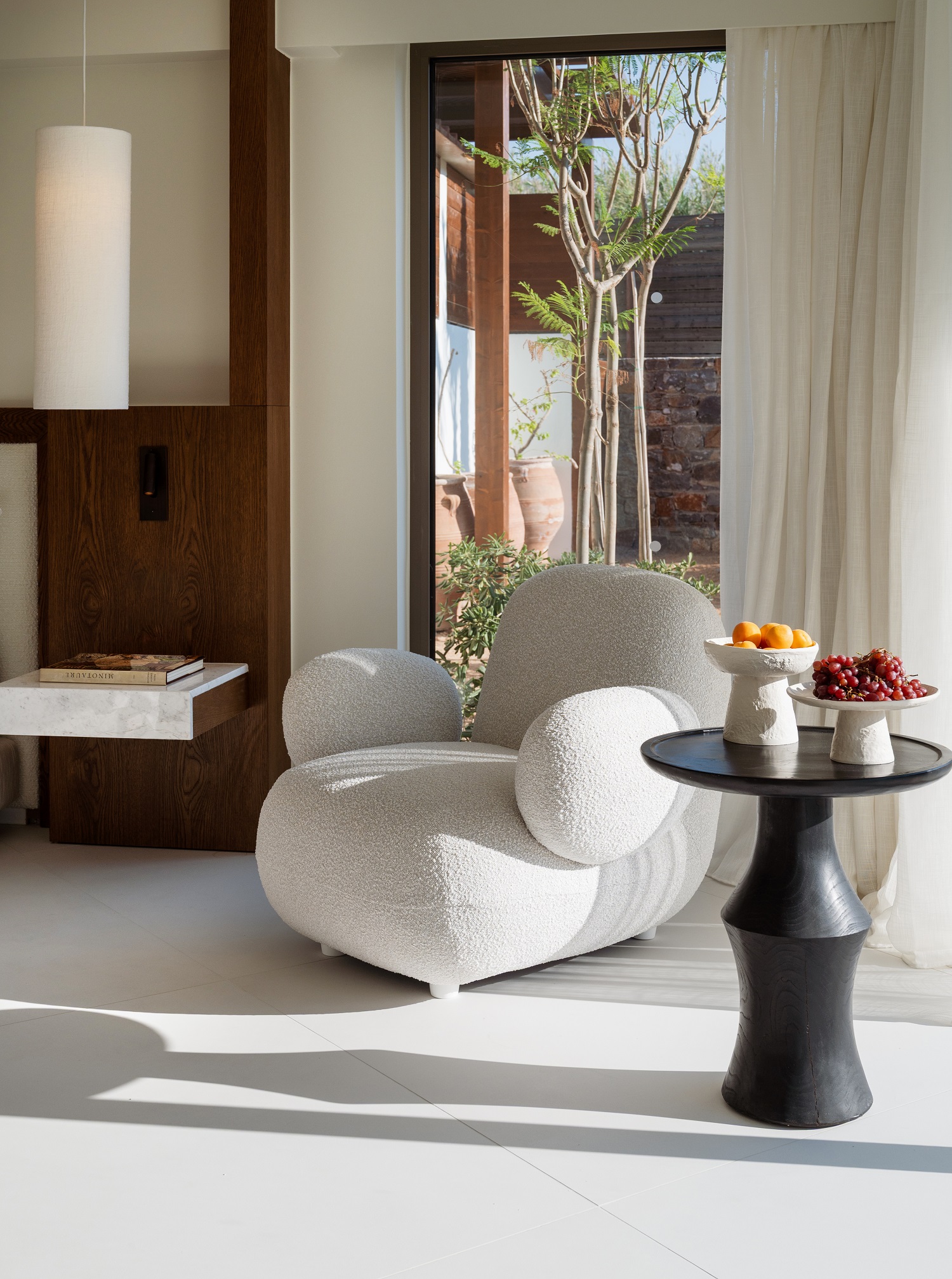 Για τη διαμονή μάς προτείνει να επιλέξουμε ανάμεσα σε γαλήνια δωμάτια, κομψές σουίτες και ευρύχωρες βίλες με ιδιωτικές πισίνες — όλα σχεδιασμένα για απομόνωση και άμεση επαφή με τη θάλασσα. Εσωτερικοί χώροι με καθαρές γραμμές και διακριτικές κρητικές πινελιές συνδυάζονται με μεγάλες γυάλινες πόρτες που ανοίγουν σε βεράντες και κήπους.