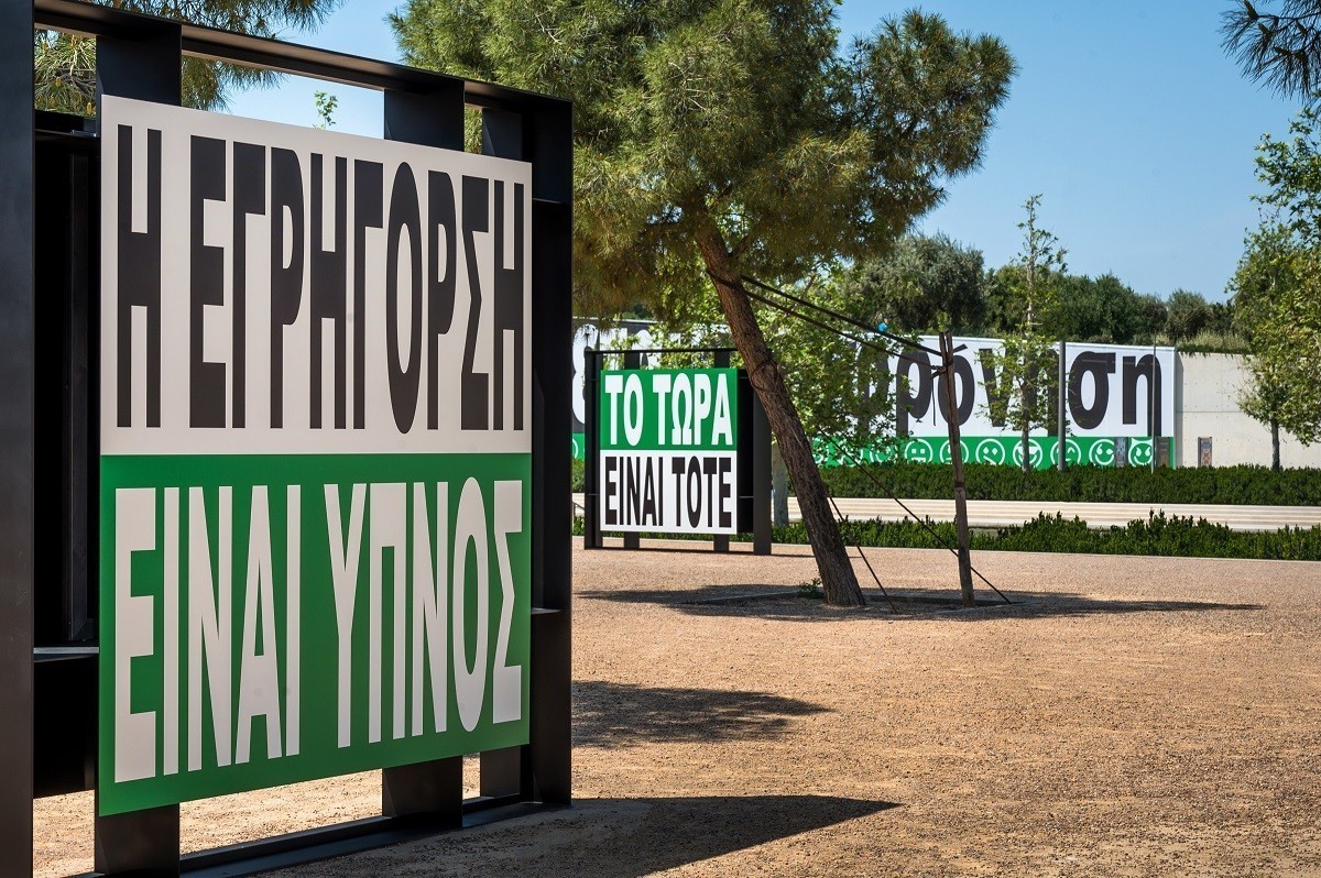 Στη νέα έκθεση στο ΚΠΙΣΝ, σε επιμέλεια της Κατερίνας Σταθοπούλου, τα έργα της παρουσιάζονται για πρώτη φορά στην ελληνική γλώσσα, δημιουργώντας έναν ενεργό διάλογο με το κοινό της χώρας μας. Φράσεις όπως «Το κακό είναι καλό», «Ο πρώτος είναι τελευταίος» και «Όλα επιτρέπονται» προσλαμβάνουν διαφορετικά νοήματα, ανάλογα με τη χρονική συγκυρία και τα προσωπικά βιώματα του καθενός. Με τις χαρακτηριστικές έντονες χρωματικές αντιθέσεις, σχολιάζουν με οξύτητα το σύγχρονο κοινωνικοπολιτικό περιβάλλον της Ευρώπης: την πόλωση, την ενίσχυση ακραίων ιδεολογιών και την αβεβαιότητα που προκύπτει από οικονομικές, μεταναστευτικές και γεωπολιτικές εντάσεις. Η έκθεση λειτουργεί ως πρόκληση και κάλεσμα προς το κοινό να αναστοχαστεί τη θέση του στον δημόσιο χώρο και την κοινωνία, θέτοντας στο επίκεντρο το ερώτημα του ποιος έχει φωνή και πώς αυτή χρησιμοποιείται.