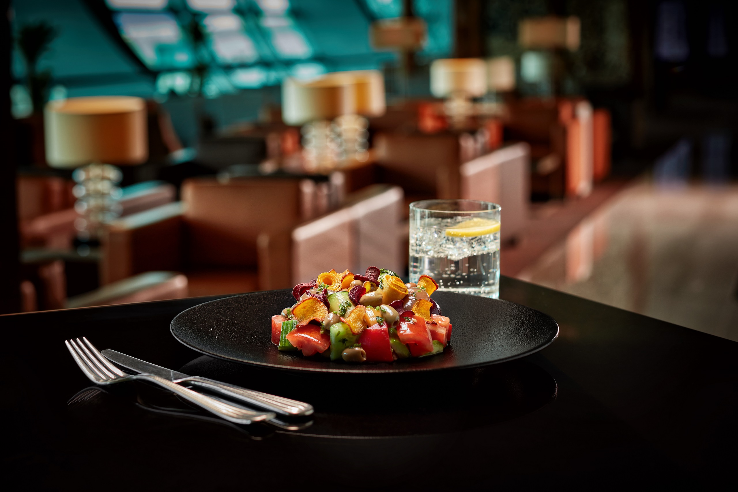 Οι επιβάτες των Διακεκριμένων Θέσεων μπορούν επίσης να δοκιμάσουν γεύματα φυτικής προέλευσης στα δύο lounges της Emirates στο Ντουμπάι, όπως ρολά βιετναμέζικου στυλ ριζόχαρτου με ήπιο πικάντικο ξίδι, Green Burger με vegan μπιφτέκι και σαλάτα με ρόκα, ταμπουλέ με κινόα ή σούπα λαχανικών και λευκών φασολιών, καθώς και υγιεινές vegan σαλάτες. Γεύματα φυτικής προέλευσης διατίθενται επίσης στα lounges της Emirates σε όλη την Ευρώπη, την Αφρική, τις ΗΠΑ και την Ασία.