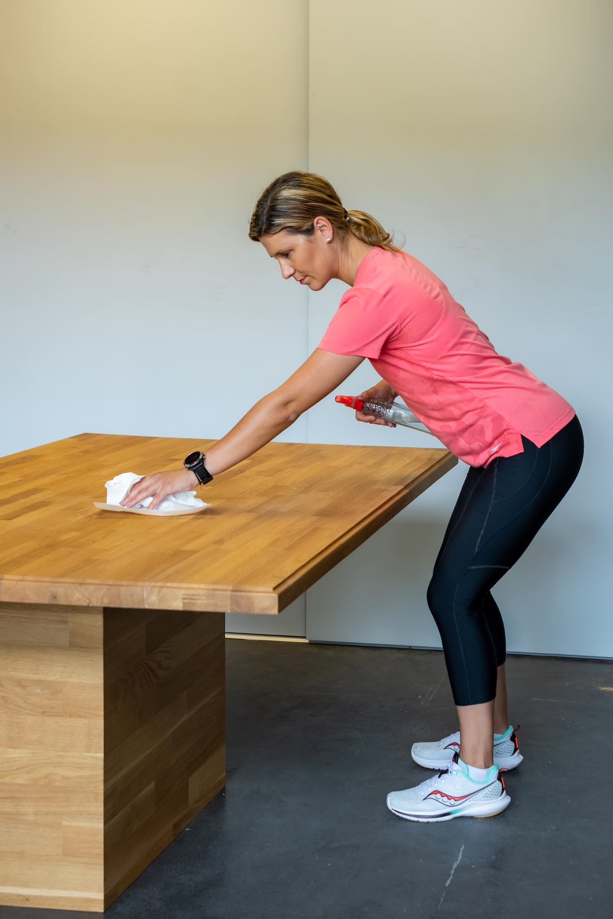 Όταν καθαρίζουμε το τραπέζι: «Λυγίζουμε τα πόδια και μετακινούμε τη λεκάνη προς τα πίσω, με τη σπονδυλική στήλη σε ουδέτερη θέση και το κεφάλι στην προέκτασή της».