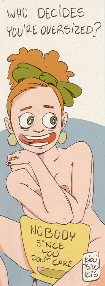 Σε αυτό το σκίτσο του λοιπόν, αναρωτήθηκε εύλογα “Ποιος αποφασίζει αν είσαι oversized;” και όντως κορίτσι, κάθισε και σκέψου, τελικά σύμφωνα με ποιον είσαι plus size; Σύμφωνα με τα standards της fashion industry, σύμφωνα με τη ζυγαριά σου, σύμφωνα με τον καθρέφτη σου, ή σύμφωνα με τη γνώμη των αντρών; To ίδιο το σκίτσο δίνει την απάντηση: “Κανείς αν δεν σε ενδιαφέρει”.