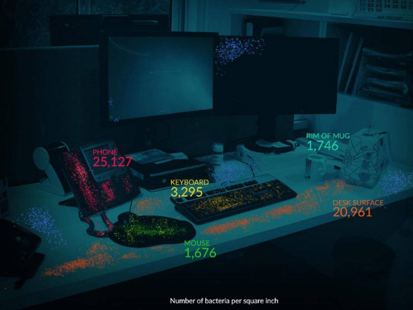 Το μέσο γραφείο αποτελεί «καταφύγιο» για 20.961 μικρόβια ανά τετραγωνική ίντσα, χωρίς να υπολογίσει κανείς τα 3.295 που ζουν στο πληκτρολόγιο, τα 1676 που ζουν στο ποντίκι και τα 25.127 που ζουν στο τηλέφωνο.
