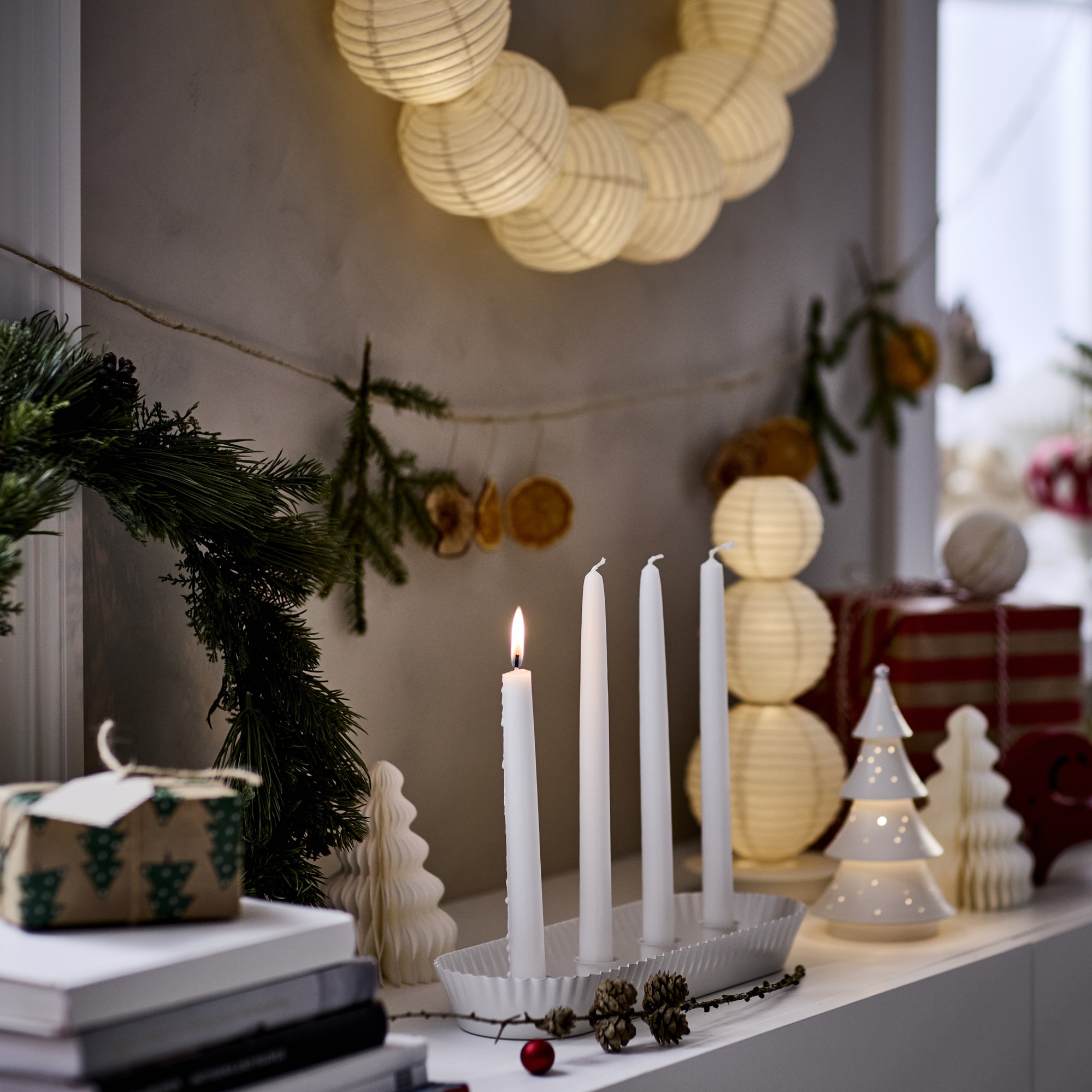 Ξεκινώντας από την είσοδο, η βασική μας επιδίωξη ήταν, ο χώρος να στολιστεί όμορφα, η εικόνα να δίνει από την πρώτη ματιά το στίγμα των γιορτών, χωρίς όμως να δείχνει στημένη. Για αρχή, ένα κηροπήγιο για 4 κεριά, αποτελεί την πιο ομαλή αφετηρία— διακριτικό, αλλά με έντονη παρουσία στον χώρο. Δίπλα του, ένα εντυπωσιακό φωτιστικό οροφής με ρυζόχαρτο απλώνει ένα απαλό, ζεστό φως. Είναι ο συνδυασμός που μας κάνει να χαλαρώνουμε μόλις μπαίνουμε στο σπίτι.