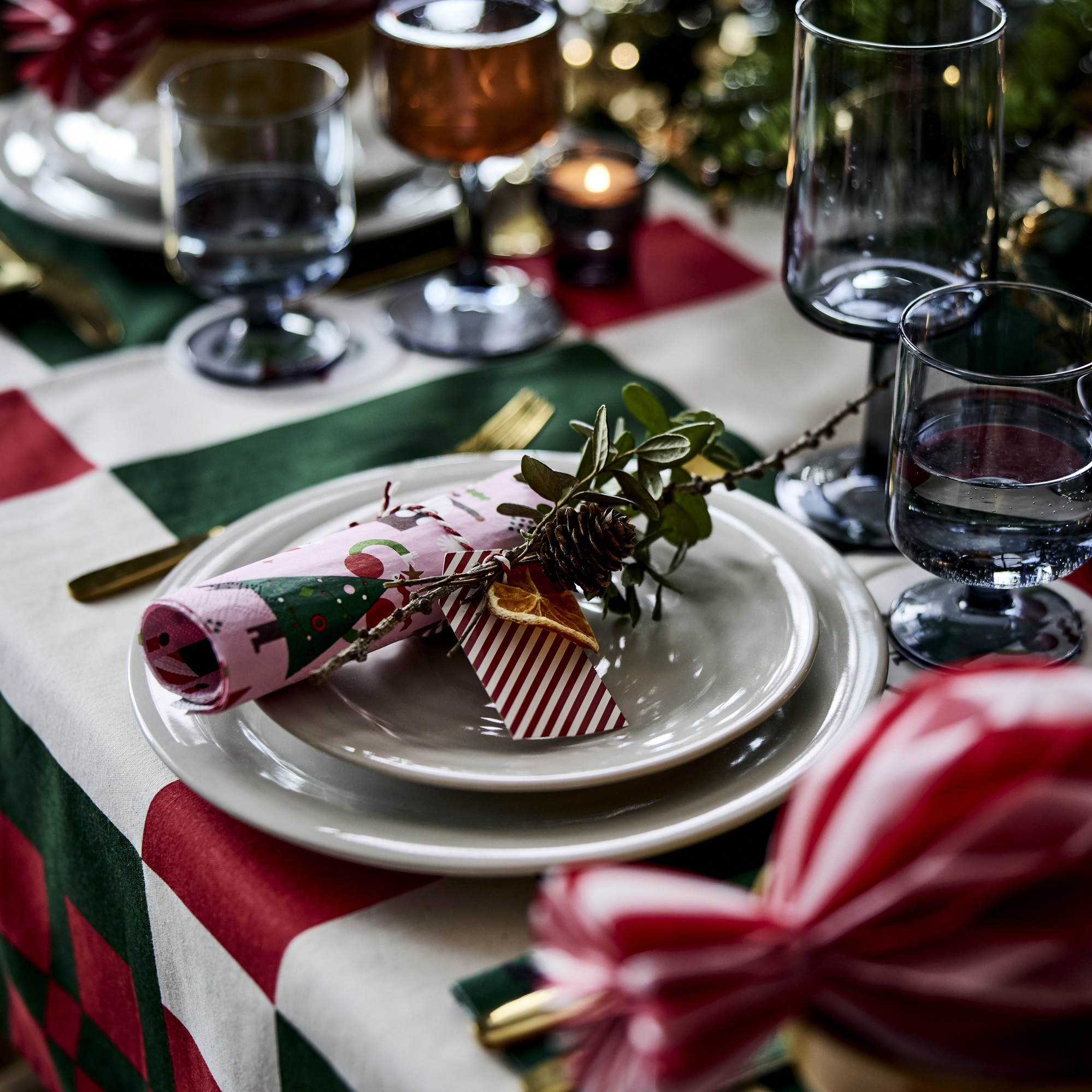 Για την τραπεζαρία, στραφήκαμε στα κλασικά χριστουγεννιάτικα χρώματα, αλλά με σύγχρονη οπτική. Ένα τραπεζομάντηλο με καρό μοτίβο σε κόκκινο και πράσινο έγινε η βάση για το γιορτινό μας τραπέζι. Πάνω του, πορσελάνινα πιάτα και φλιτζάνια συνδυάζουν μινιμαλισμό και παιχνιδιάρικη διάθεση, αποτελώντας την απόλυτη αναβάθμιση για το γιορτινό τραπέζι. Είναι πολύ σημαντικό επίσης, ότι κάθε αντικείμενο έχει σχεδιαστεί για να χρησιμοποιείται πραγματικά, όχι μόνο να διακοσμεί.