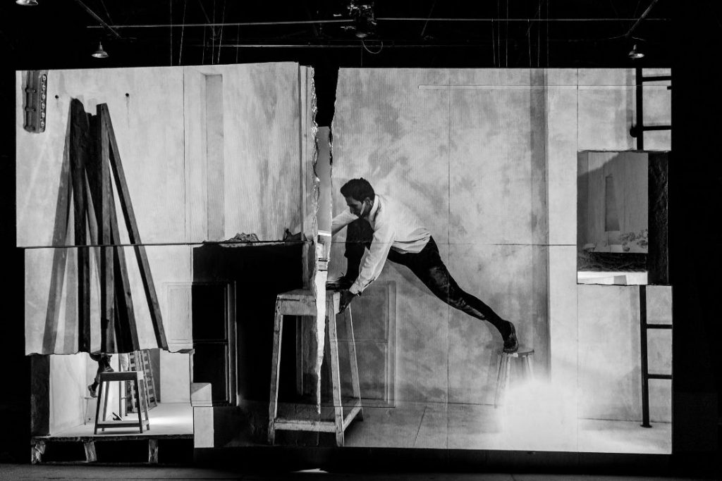 Να και κάτι που δεν είχα ξαναδεί στο θέατρο: Το κοινό οδηγείται στις θέσεις του αφού περάσει περπατώντας μπροστά από τις τέσσερις, σωστά διαβάσατε, τέσσερις πλευρές του σκηνικού που είναι ένας μεγάλος λευκός κύβος, ας τον ονομάσουμε σπίτι, μία κατασκευή που βλέπουμε το εσωτερικό της από ανοίγματα, πόρτες, παράθυρα και μπαλκόνια, αλλά κυρίως από κάμερες που υπάρχουν τοποθετημένες παντού και προβάλλουν στους εξωτερικούς τοίχους τι συμβαίνει μέσα. Ένας ηθοποιός-περφόρμερ/χορευτής/ακροβάτης.