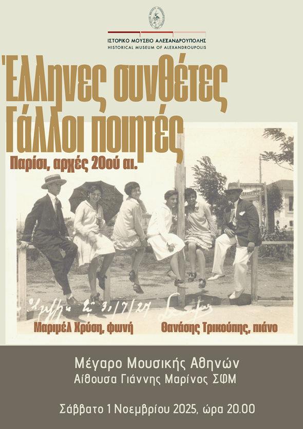 Μια ξεχωριστή μουσική βραδιά με ιστορική και καλλιτεχνική αξία έρχεται το Σάββατο 1 Νοεμβρίου 2025, στις 20:00, στο Μέγαρο Μουσικής Αθηνών (Αίθουσα Γιάννης Μαρίνος). Το Ιστορικό Μουσείο Αλεξανδρούπολης παρουσιάζει το ρεσιτάλ «Έλληνες συνθέτες, Γάλλοι ποιητές – Παρίσι, αρχές 20ού αι.», με την υψίφωνο Μαριμέλ Χρύση και τον πιανίστα Θανάση Τρικούπη.