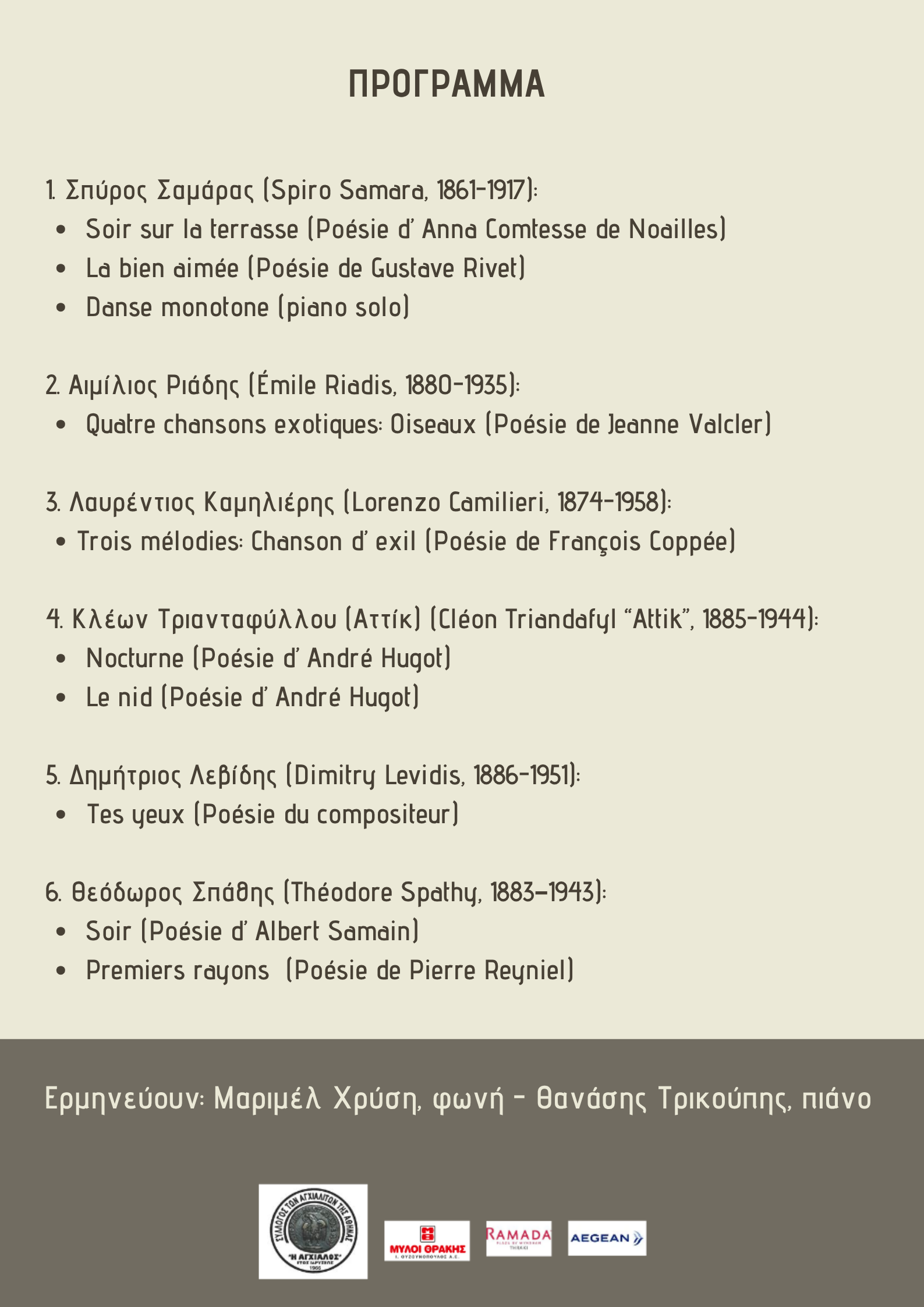Η εκδήλωση είναι αφιερωμένη στη μελοποίηση γαλλικής ποίησης από Έλληνες συνθέτες που έζησαν και δημιούργησαν στο Παρίσι στις αρχές του 20ού αιώνα – μια εποχή κατά την οποία η γαλλική μουσική και λογοτεχνία επηρέασαν καθοριστικά τη σύγχρονη ελληνική δημιουργία.