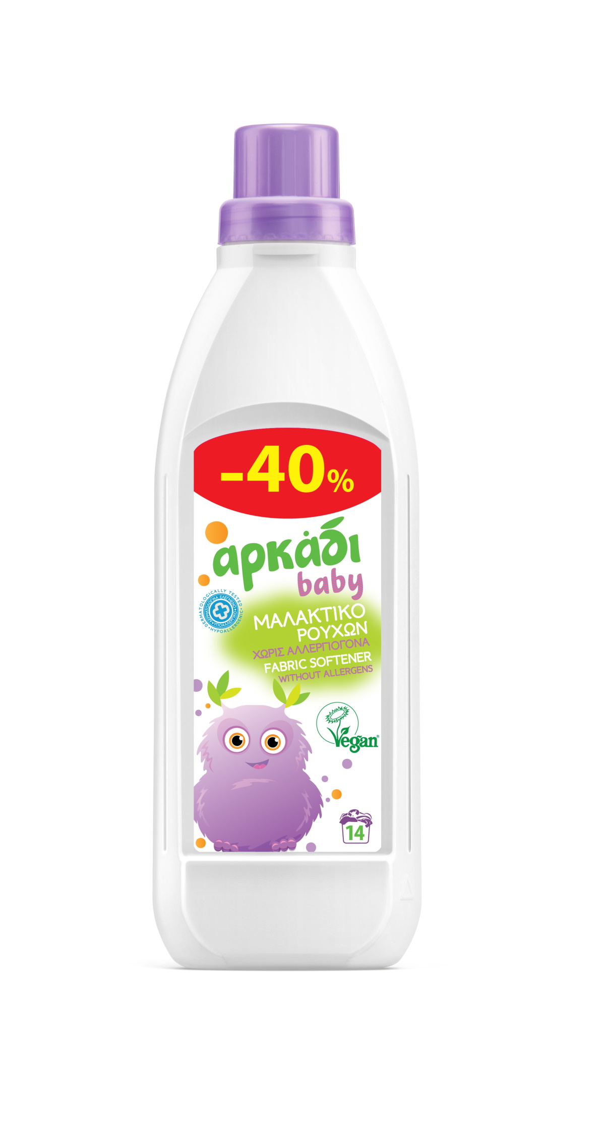 Το φυσικό, κατάλληλο για Vegan , μαλακτικό υγρό ρούχων με φυσικό εκχύλισμα ελιάς για βρέφη Αρκάδι Baby, είναι διαθέσιμο σε συσκευασία 1 It, για 14 πλύσεις, σε όλα τα σημεία λιανικής πώλησης των δικτύων των μεγάλων αλυσίδων Super Market αλλά και σε αρκετά e-shop.