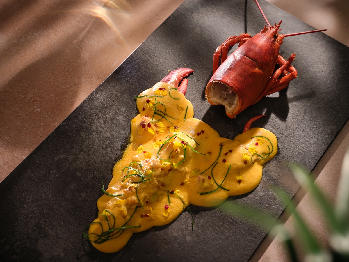 Blue Lobster: Αστακός με σάλτσα hollandaise rocoto, τσιπς από κασάβα, φρέσκο κρεμμύδι, βρώσιμα λουλούδια