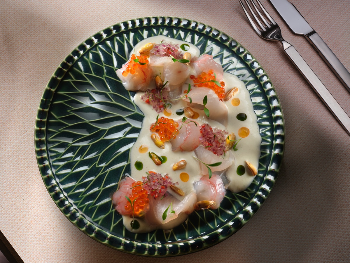 Langoustines Cebiche: Καραβίδες, ψάρι ημέρας, καλαμπόκι cancha, γλυκοπατάτα, λάδι κόλιανδρου, αυγά πέστροφας, ajo blanco leche de tigre