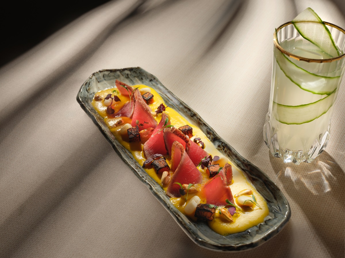Tuna Tiradito: Κοιλιά τόνου στη σχάρα, καπνιστό κίτρινο leche de tigre, γλυκοπατάτα, choclo, cancha και φύλλα κόλιανδρου