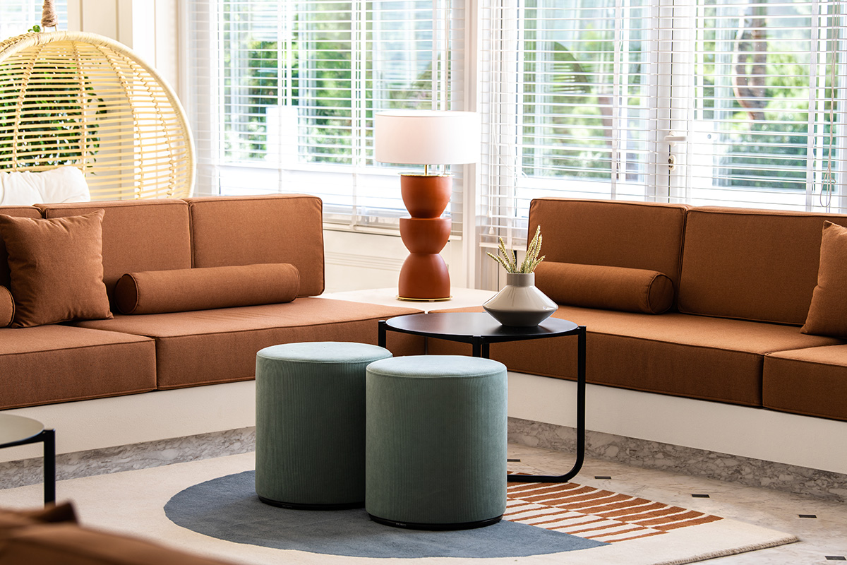 Στους εσωτερικούς και εξωτερικούς χώρους του resort αναδεικνύονται με ιδιαίτερο τρόπο τα ρετρό δομικά και διακοσμητικά του στοιχεία, στα οποία κυριαρχούν τα γεωμετρικά μοτίβα, οι μαρμάρινες λεπτομέρειες, τα ψηφιδωτά και τα κεραμικά.