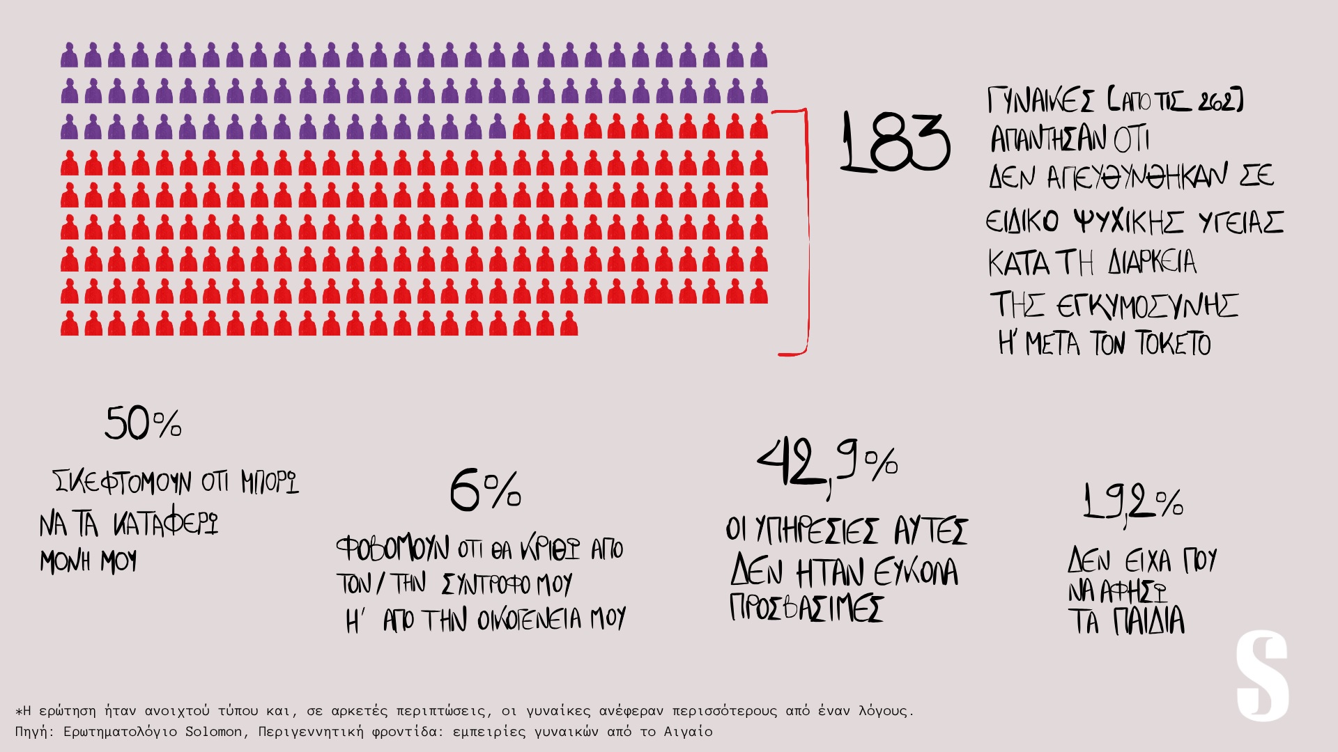 Η συστημική φύση του ζητήματος, ωστόσο, εδράζεται και αλλού: το 76% των συμμετεχουσών στην έρευνα απάντησε πως κανένας επαγγελματίας υγείας δεν τις ρώτησε για τη συναισθηματική τους κατάσταση.
