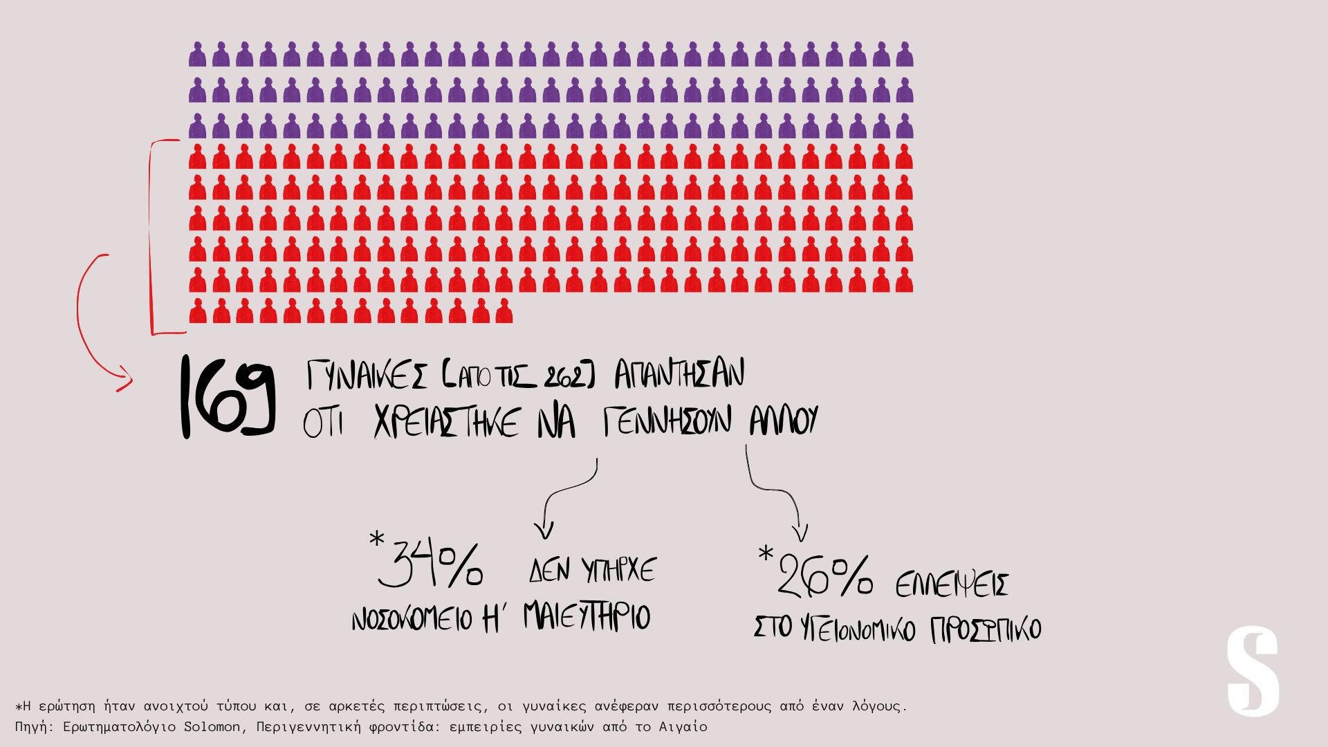 Το Solomon μίλησε με εγκύους, μητέρες, μαίες, οργανώσεις και ειδικούς ψυχικής υγείας. Δημιούργησε ερωτηματολόγιο στο οποίο απάντησαν 262 γυναίκες από 40 διαφορετικά νησιά του Αιγαίου, οι οποίες γέννησαν μέσα σε ένα χρονικό διάστημα 35 ετών: από το 1990 μέχρι το 2025.