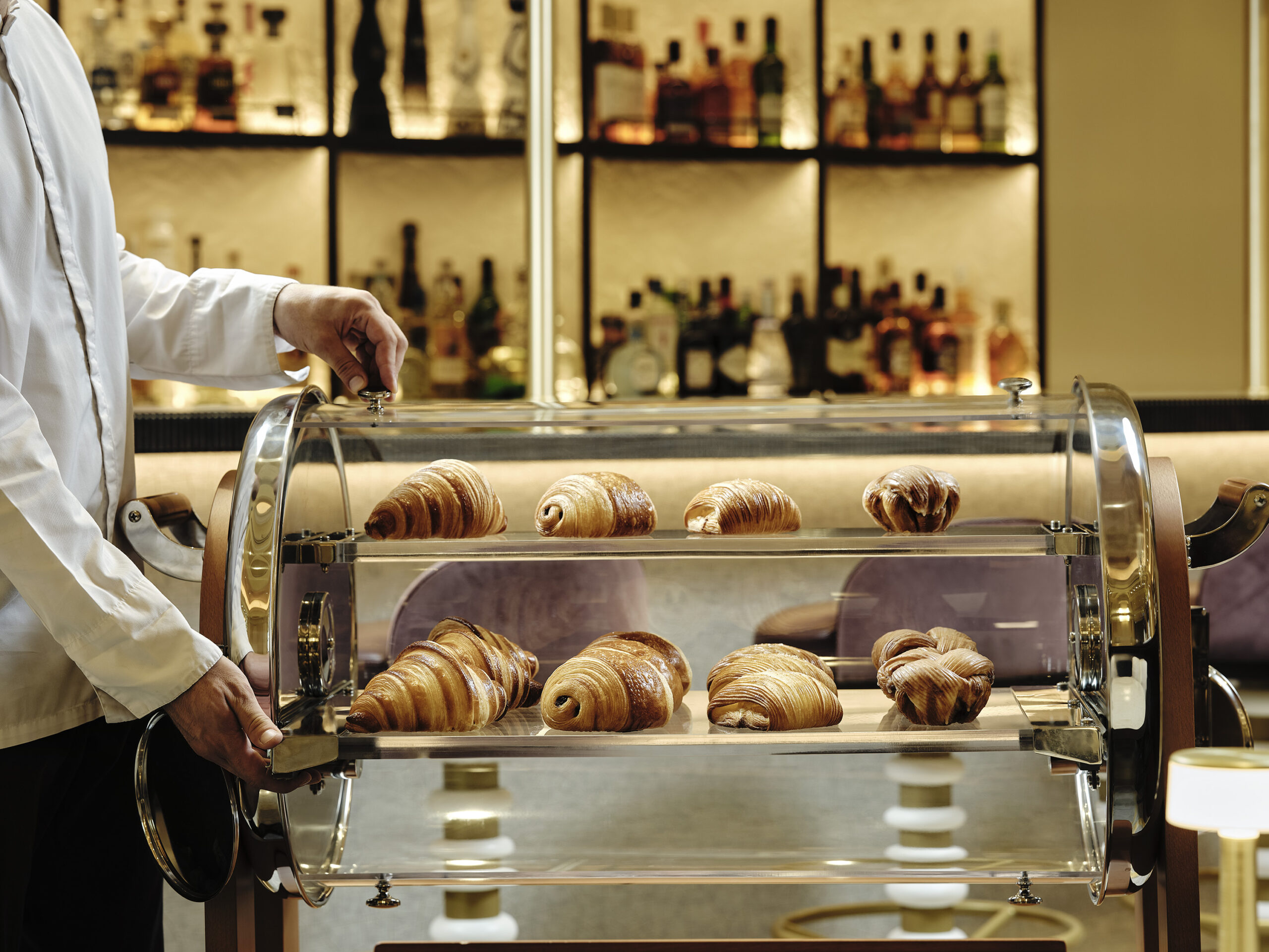 Όμως, στο George, The Lobby Bar, δεν βρίσκει κανείς μόνο brunch και καφέ, αλλά στην πραγματικότητα η εμπειρία ανεβαίνει επίπεδο καθώς στο παιχνίδι μπαίνει επίσης και το φαγητό, αλλά και τα ιδιαίτερα cocktails που προσφέρει. Όσο ανεβαίνει η διάθεση και χαμηλώνουν τα φώτα, τόσο περισσότερο κάνουν την εμφάνισή τους τα ποτά. Gin, tequila και πολλά ακόμα, έρχονται να συνοδεύσουν τα snacks του bar, όπως bao με γαρίδα tempura, lobster mac & cheese, beef tartare éclair. Τέλος, οι πορσελάνες Ecaille crème και οι στολές Zeus + Dione προσθέτουν τη δική τους διακριτική υπογραφή στην αισθητική του χώρου.
