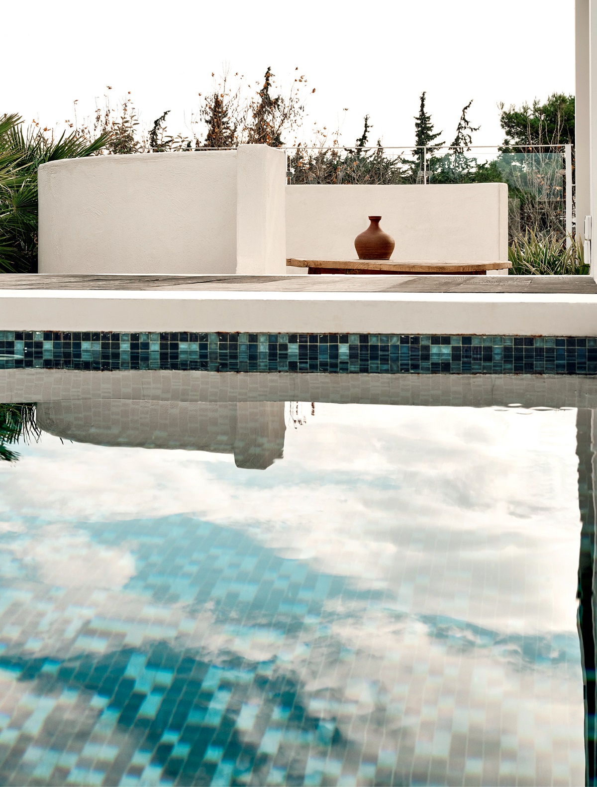 Στους πιο ιδιωτικούς χώρους του σπιτιού, στο μεγάλο υπνοδωμάτιο με το δικό του μπάνιο, στο WC των επισκεπτών και βέβαια στην τέλεια γκαρνταρόμπα φτάνει κανείς μέσω ενός διαδρόμου. Μια φαρδιά πορτοκαλί σκάλα οδηγεί στον δεύτερο όροφο, εκεί όπου μπορεί να θαυμάσεις ένα έργο του Γιώργου Βαβυλουσάκη ή το εξώφυλλο ενός πολύ σπάνιου άλμπουμ, του «Dizzy in Greece», με τον Dizzy Gillespie φωτογραφημένο με παραδοσιακή ελληνική ενδυμασία να ακουμπάει σε αρχαία μάρμαρα. Στον ίδιο όροφο βρίσκεται το καθιστικό, αλλά και η πόρτα του παραδείσου: είναι αυτή που οδηγεί προς την εξωτερική πισίνα της κατοικίας, τη μικρή, αναγκαία όαση στο αστικό τοπίο.