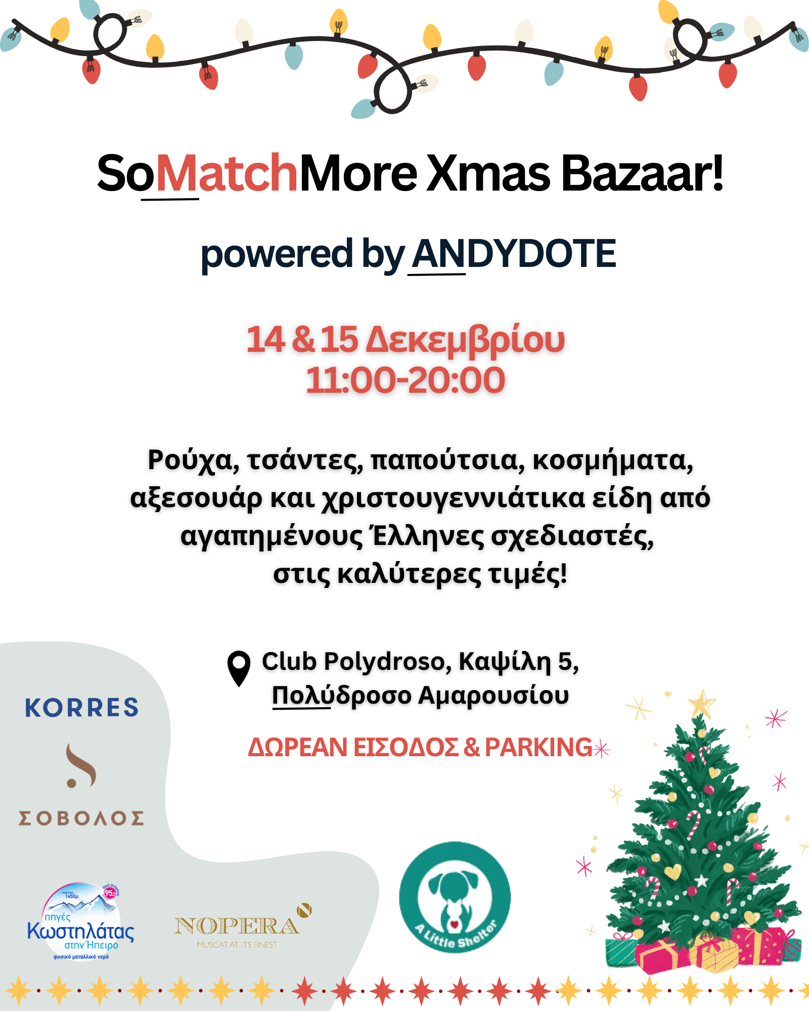 Για δύο ημέρες θα έχετε την ευκαιρία να αποκτήσετε μοναδικά κομμάτια, μόδας, ομορφιάς και διακόσμησης και ταυτόχρονα να βοηθήσετε το έργο του A little shelter. To Σαββατοκύριακο 14 και 15 Δεκεμβρίου διοργανώνεται το SoMatchmore Christmas Bazaar 2024 powered by…ANDYDOTE!