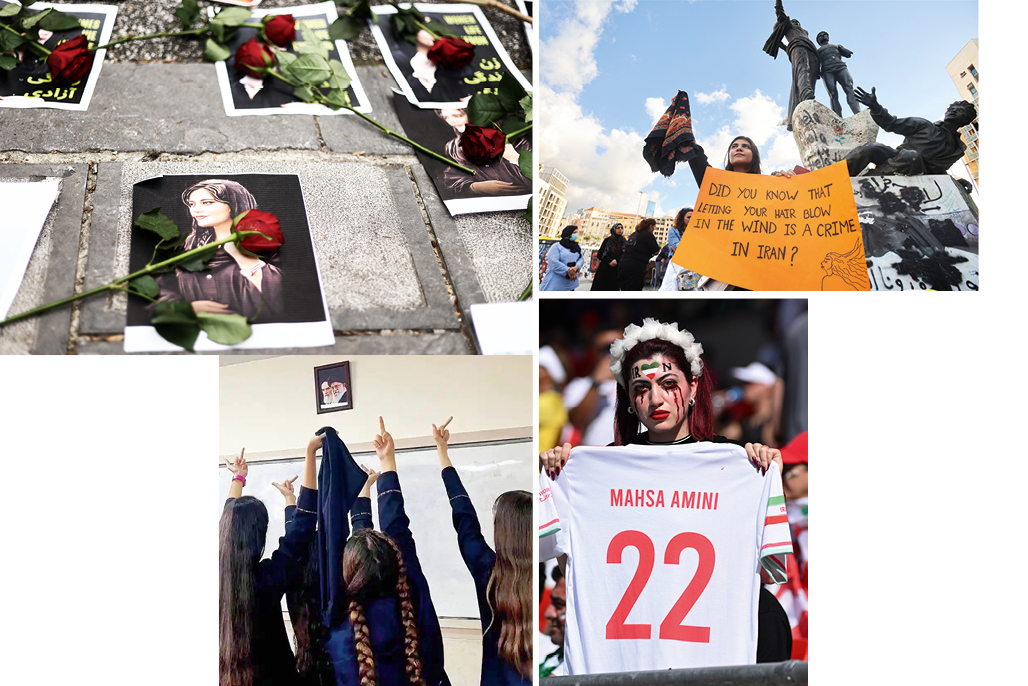 Από πάνω αριστερά και δεξιόστροφα: Λουλούδια πάνω στο πορτρέτο της Μάχσα Αμίνι στη διαμαρτυρία έξω από την ιρανική πρεσβεία στις Βρυξέλλες, στις 23 Σεπτεμβρίου 2022. Κούρδες και γυναίκες από τον Λίβανο συμμετέχουν σε διαδήλωση στη Βηρυτό στις 21 Σεπτεμβρίου, λίγες μέρες αφοότου οι ιρανικές αρχές ανακοίνωσαν το θάνατο της Μάχσα Αμίνι. Μια γυναίκα διαμαρτύρεται βαμμένη με αίμα για το θάνατο της Αμίνι, στον αγώνα Ουαλία – Ιράν για το Μουντιάλ στην Ντόχα του Κατάρ, στις 25 Νοεμβρίου. Μαθήτριες υψώνουν το μεσαίο δάχτυλο στο πορτρέτο που εικονίζει τους ηγέτες του Ιράν μέσα σε σχολική τάξη, έχοντας μάλιστα αφαιρέσει τις μαντίλες τους.