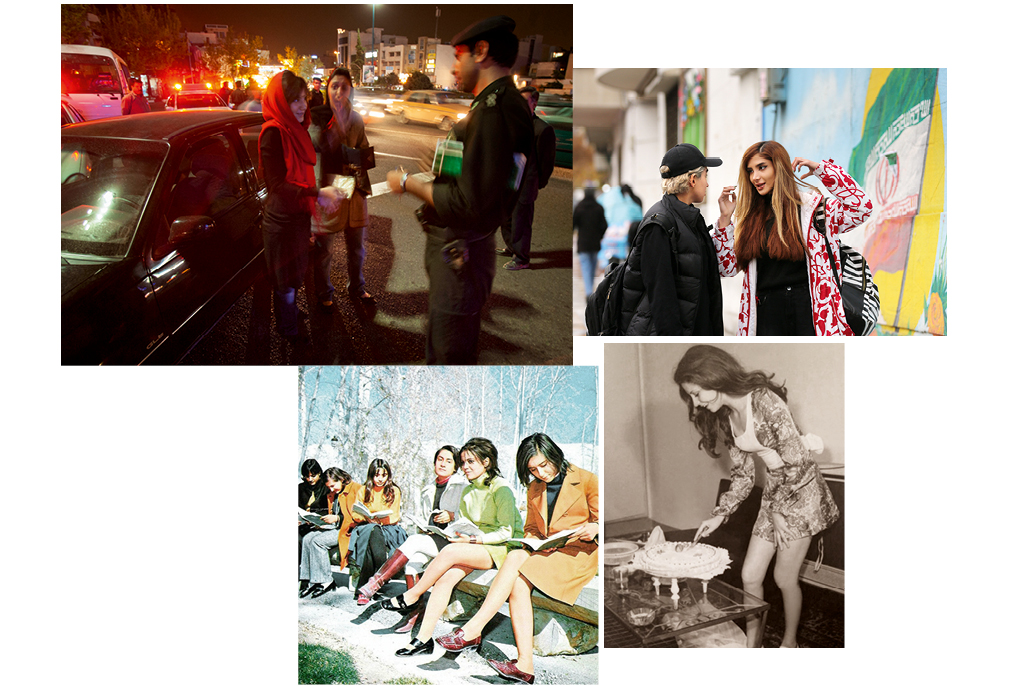 Από πάνω αριστερά και δεξιόστροφα: Εκπρόσωπος της Aστυνομίας της Hθικής μιλάει με γυναίκα στην Τεχεράνη. Νέοι της Τεχεράνης τον Δεκέμβριο του 2022. Η ανακοίνωση του εισαγγελέα Μοχάμεντ Τζαφάρ Μονταζέρι ότι καταργείται η Aστυνομία της Hθικής στις αρχές του μήνα θεωρείται επικοινωνιακό τέχνασμα κατευνασμού της παγκόσμιας κοινής γνώμης. Καθημερινά, οι συλλήψεις, οι βασανισμοί και οι καταδίκες σε θάνατο συνεχίζονται. Μία νέα γυναίκα κόβει την τούρτα γενεθλίων της στο Ιράν το 1973, πέντε χρόνια προτού η Ισλαμική Επανάσταση βυθίσει τη χώρα στο σκοτάδι. Δεκαετία του ’70, ένα άλλο Ιράν. Φοιτήτριες χωρίς μαντίλες, ντυμένες με χρώματα, μίνι.