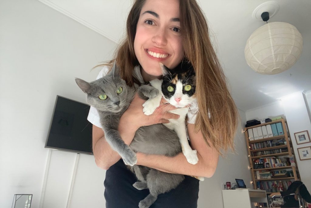 Είναι πανεύκολο. Είναι το πιο εύκολο πράγμα στον κόσμο. Τα ζώα στο σπίτι κάνουν τις μέρες της καραντίνας να περνούν πάρα πολύ γρήγορα. Είναι περίεργο γιατί ποτέ μου δεν είχα περάσει τόσο χρόνο στο σπίτι μαζί τους. Δεν είχα ιδέα πως περνάει η μέρα τους, όλη η μέρα τους. Είναι το ίδιο περίεργο και για εκείνες βέβαια.Ένα παιχνίδι που είχα πάρει στις γάτες πριν 1 χρόνο τώρα έβγαλε τα λεφτά του! (Γέλια.) Παίζουν άπειρα μεταξύ τους και με τσιγκλάνε κι εμένα, εννοείται. Κάνουν πολλούς πρωτόγνωρους ήχους, είναι εξαιρετικά ομιλητικές και καταλαβαίνουν ακριβώς αυτό που τους λέω. Η αγάπη μας πια είναι σε άλλο επίπεδο. Η Τζίνη, που είναι μια γάτα πολύ περίεργη και απόμακρη, έχει γίνει βούτυρο! Κι όταν χαλαρώνουν είναι το πιο όμορφο θέαμα. Χαλαρώνεις κι εσύ με τα γουρ γουρ και τη ζεστασιά. Μιλάω πιο πολύ για τις γάτες γιατί η Δόμνα (σ.σ. το σκυλί της) πρόλαβε να πάει στους γονείς μου κι έτσι έχουν κι αυτοί την παρέα τους και την αφορμή για βόλτα βέβαια! Εγώ πηγαίνω για τρέξιμο! Ωστόσο, για τους σκύλους είναι σημαντική και η δική τους υγιεινή μετά τη βόλτα. Καθαρίζουμε σχολαστικά τα πατουσάκια, όπως και τα χεράκια μας!