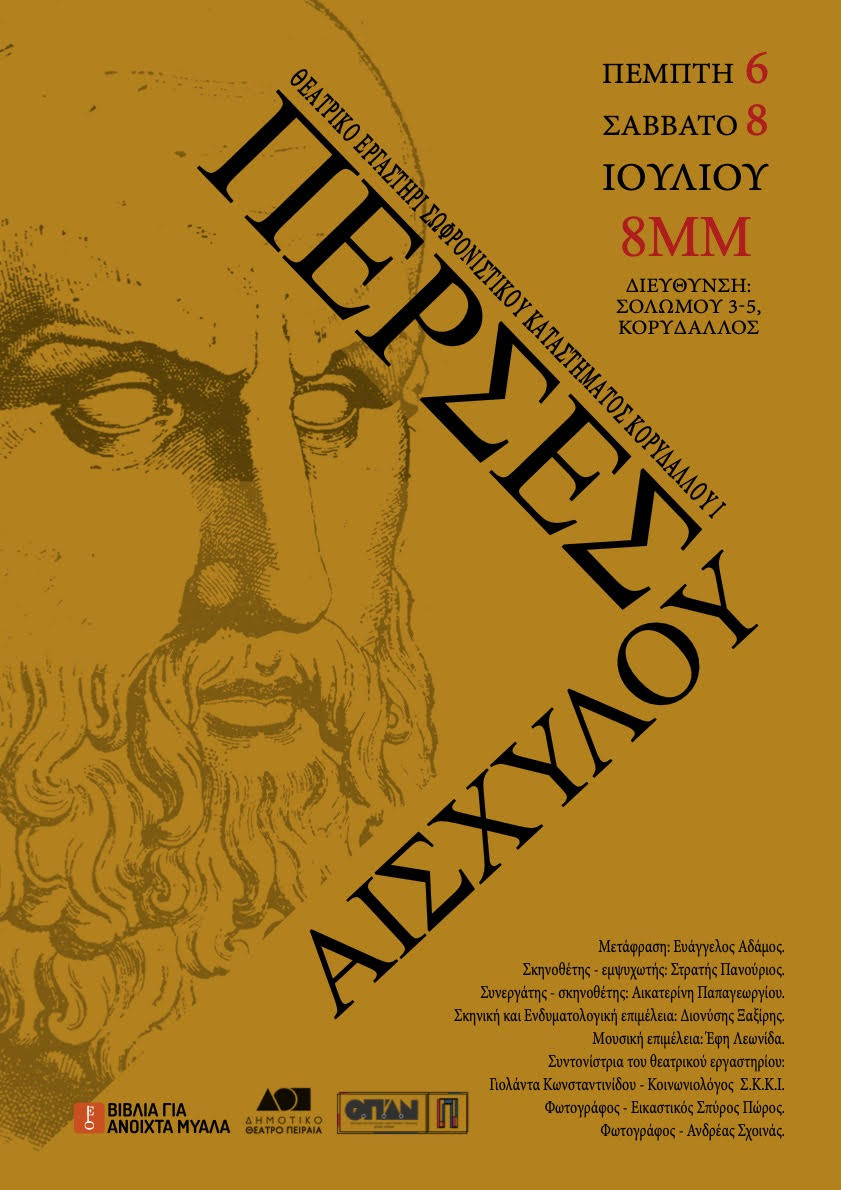 Με τους «Πέρσες» του Αισχύλου καταπιάνεται φέτος η θεατρική ομάδα των κρατουμένων του Σωφρονιστικού Καταστήματος Κορυδαλλού Ι. Το θεατρικό πρόγραμμα υποστηρίζεται από την Γενική Γραμματεία Αντεγκληματικής Πολιτικής, το Δημοτικό Θέατρο Πειραιά και το Σωφρονιστικό Κατάστημα. Το πρόγραμμα συντονίζει η Κοινωνιολόγος και Υπεύθυνη Συντονίστρια των Πολιτιστικών Δράσεων του Σωφρονιστικού Καταστήματος, Γιολάντα Κωνσταντινίδου.
