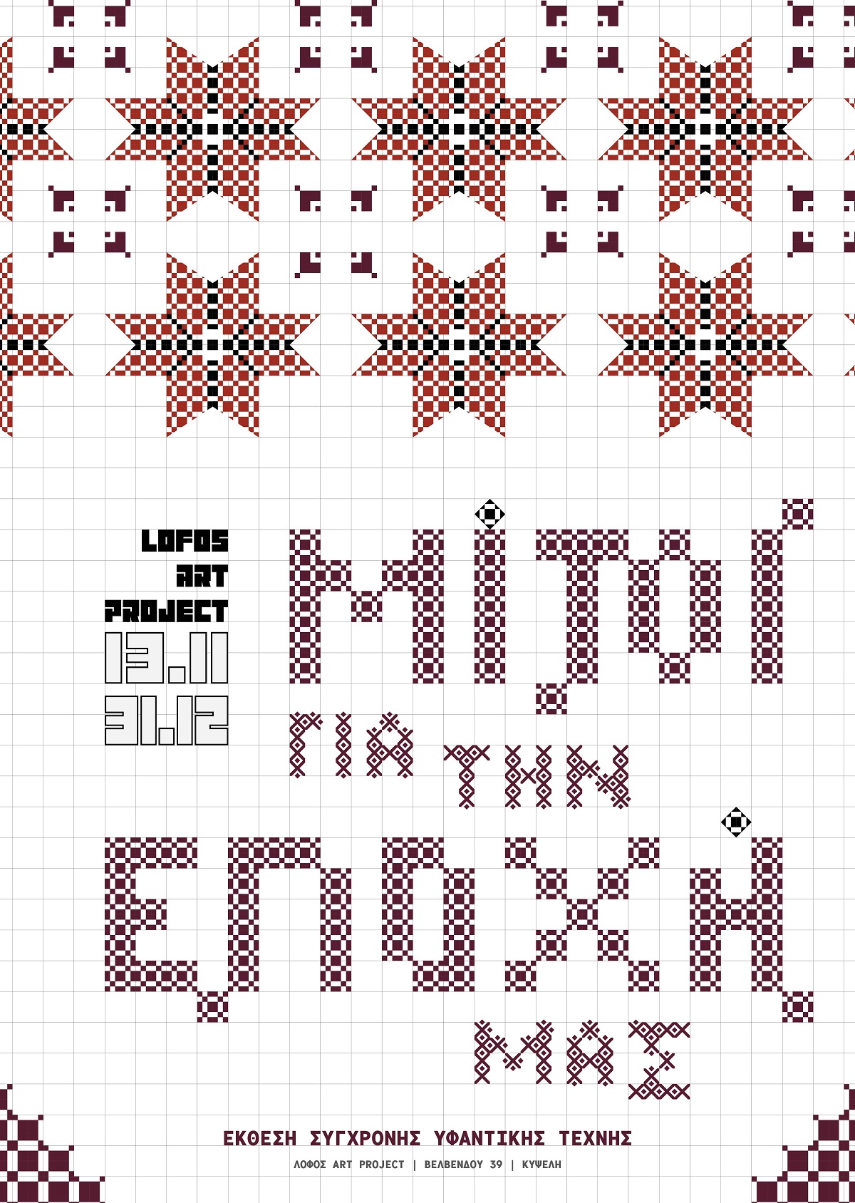 Μια νέα, μεγάλη έκθεση εγκαινιάζεται την Πέμπτη 13 Νοεμβρίου στις 19:30 στο Λόφος Art Project με τη συμμετοχή 42 σύγχρονων Ελλήνων καλλιτεχνών που εκφράζονται μέσω της υφαντικής τέχνης, σε επιμέλεια Δημήτρη Σαραφιανού. Τίτλος της, «Μίτοι για την εποχή μας».