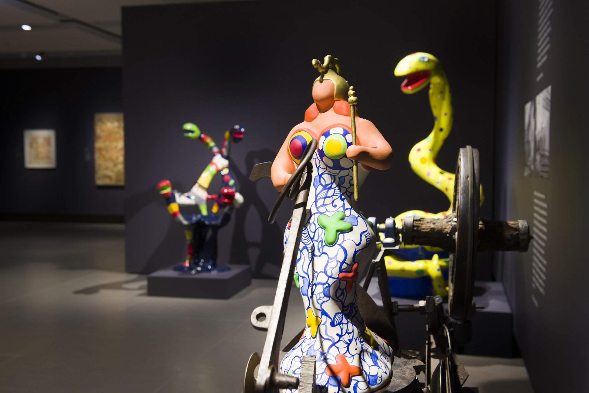 «Έχουμε ένα υπέροχο έργο, που είχαν δημιουργήσει μαζί με τον Tinguely το 1989, λίγο πριν από το θάνατό του, που είναι η Αθηνά Παλλάδα πάνω στο άρμα της. Νομίζω ότι συνοψίζει πάρα πολύ ωραία τη σχέση τους. Η θεά Αθηνά της Saint Phalle, χυμώδης, εντυπωσιακή, με τα ωραία της χρώματα, θυμίζει τις “Nanas”. Είναι επάνω σε ένα άρμα που έχει φτιάξει ο Tinguely, το οποίο είναι οτιδήποτε εκτός από βασιλικό ή θεϊκό, φτιαγμένο από κομμάτια ξύλου και σιδήρου. Είναι η συνομιλία δύο βλεμμάτων. Η Saint Phalle το έλεγε πολύ καθαρά, εγώ κάνω θηλυκή τέχνη και ο Jean, με τα σίδερα και τα μαύρα κομμάτια ξύλου, αρσενική» εξηγεί η κ. Κουτσομάλλη-Moreau.