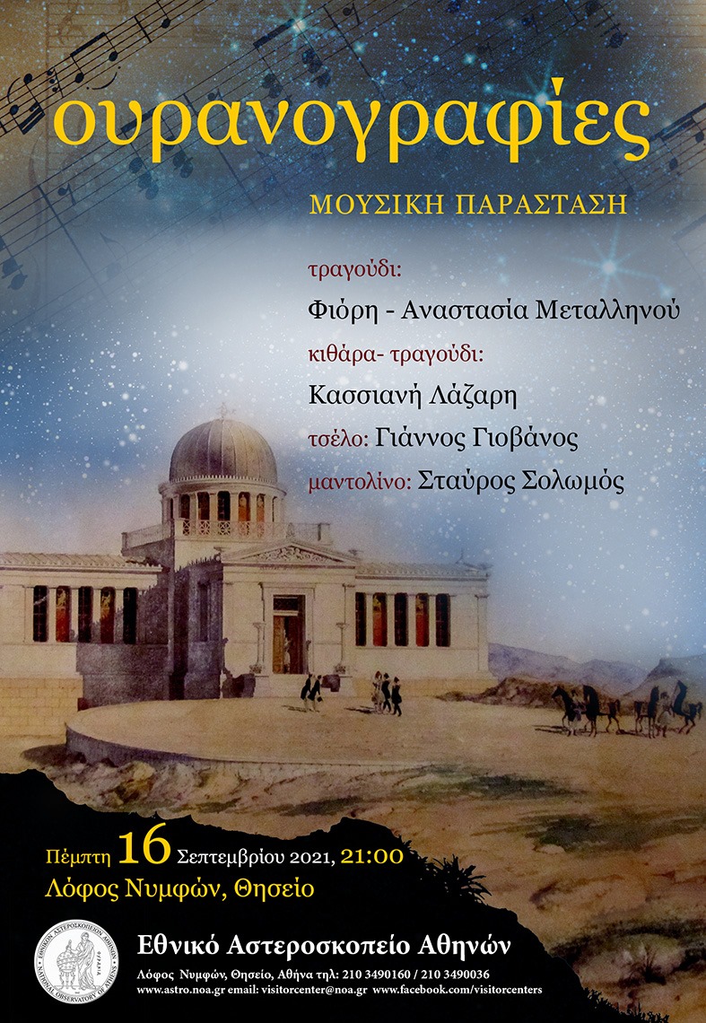 Στον προαύλιο χώρο του ιστορικού κτηρίου Σίνα, στο λόφο των Νυμφών, θα ερμηνευθούν τραγούδια ελλήνων συνθετών, αλλά και πρωτότυπες συνθέσεις οι οποίες αναφέρονται σε αντικείμενα του βραδινού ουρανού. Τραγούδια για την σελήνη, τους πλανήτες, τα αστέρια, τη νύχτα. Μια ομάδα μουσικών, αλλά και επιστημόνων, συνομιλούν με την επιστήμη και την τέχνη, σε ένα ταξίδι από τη γη στον ουρανό.