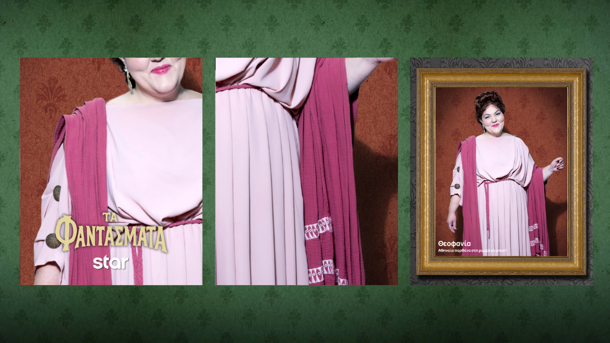 Το κοστούμι της Θεοφανίας: Αποτελείται από σύνθεση φυτικών και τεχνητών υφασμάτων, που κρίθηκε η καταλληλότερη λύση ώστε να αποδοθεί η χυτή αρχαιοελληνική εικόνα. Τα σανδάλια είναι από χειροποίητο δέρμα, ενώ τα σκουλαρίκια από επιχρυσωμένο ασήμι και οι μπρονζέ πόρπες, που συγκρατούν το ύφασμα, βρέθηκαν σε ένα εξειδικευμένο παλαιοπωλείο.