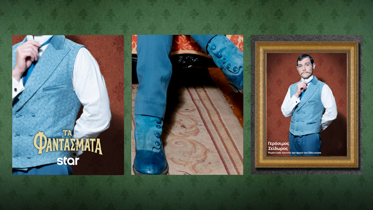 Το κοστούμι του Γεράσιμου: Ένα κοστούμι από ύφασμα με αναφορά στα τέλη του 19ου αιώνα, με μπροκάρ γιλέκο και ανυψωμένο κολάρο, όλα σε γαλάζιους τόνους με ειδική πατίνα και επεξεργασία. Τα παπούτσια είναι αυθεντική αναπαράσταση των παπουτσιών με κουμπιά εκείνης της εποχής.