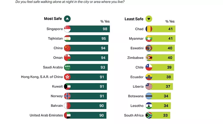 Σε παγκόσμιο επίπεδο, το 73% των ενηλίκων δηλώνει ότι αισθάνεται ασφαλές να περπατά μόνο του τη νύχτα στην πόλη ή την περιοχή όπου ζει. Αυτό είναι και το υψηλότερο ποσοστό που έχει καταγραφεί από το 2006, με αύξηση 13% την τελευταία δεκαετία.