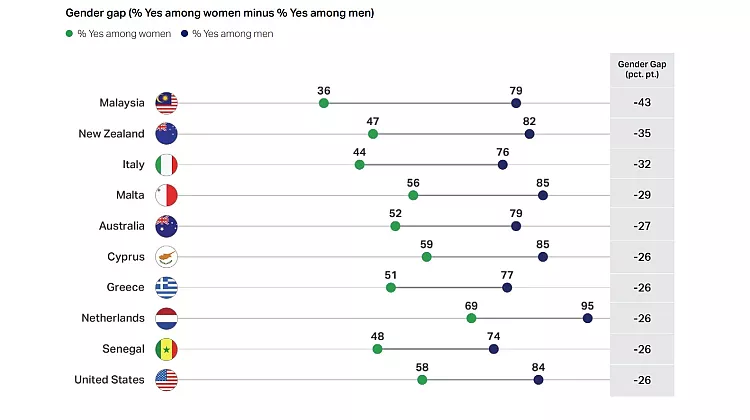Η Gallup επισημαίνει και μια σημαντική διαφορά ανάμεσα στα φύλα: παγκοσμίως, το 32% των γυναικών δηλώνει ότι δεν αισθάνεται ασφαλές να περπατά τη νύχτα, σε αντίθεση με το 21% των ανδρών.