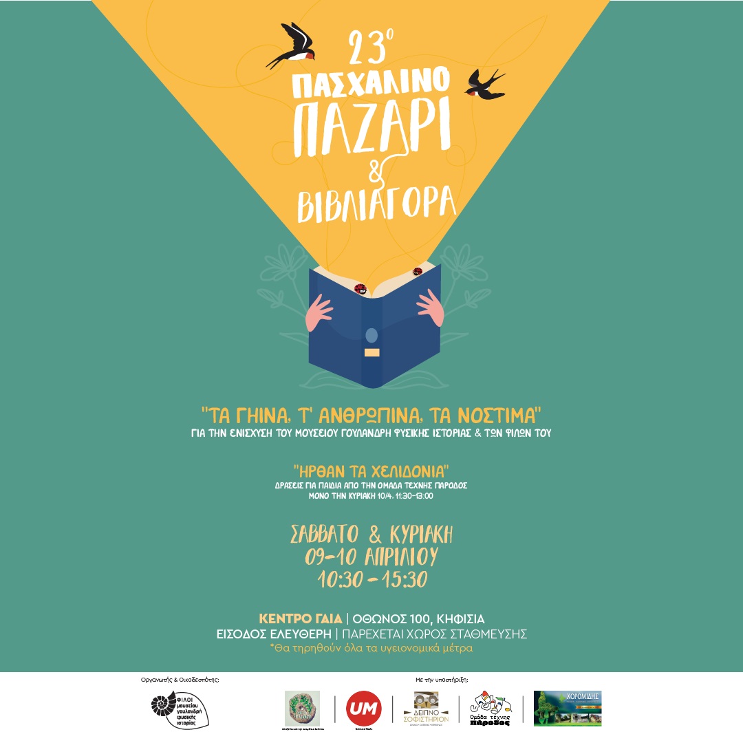Το 23ο Πασχαλινό Παζάρι «Τα γήινα, τ’ ανθρώπινα, τα νόστιμα», διοργανώνεται για την ενίσχυση του Μουσείου Γουλανδρή Φυσικής Ιστορίας και των φίλων του στις 9 και 10 Απριλίου από τις 10:30 έως τις 15:30 στο Κέντρο ΓΑΙΑ (Όθωνος 100, Κηφισιά). Μάλιστα, την Κυριακή 10/4, από τις 11:30 έως τις 13:00, η Ομάδα Τέχνης ΠΑΡΟΔΟΣ, θα παρουσιάσει στα παιδιά το δρώμενο «Ήρθαν τα χελιδόνια».