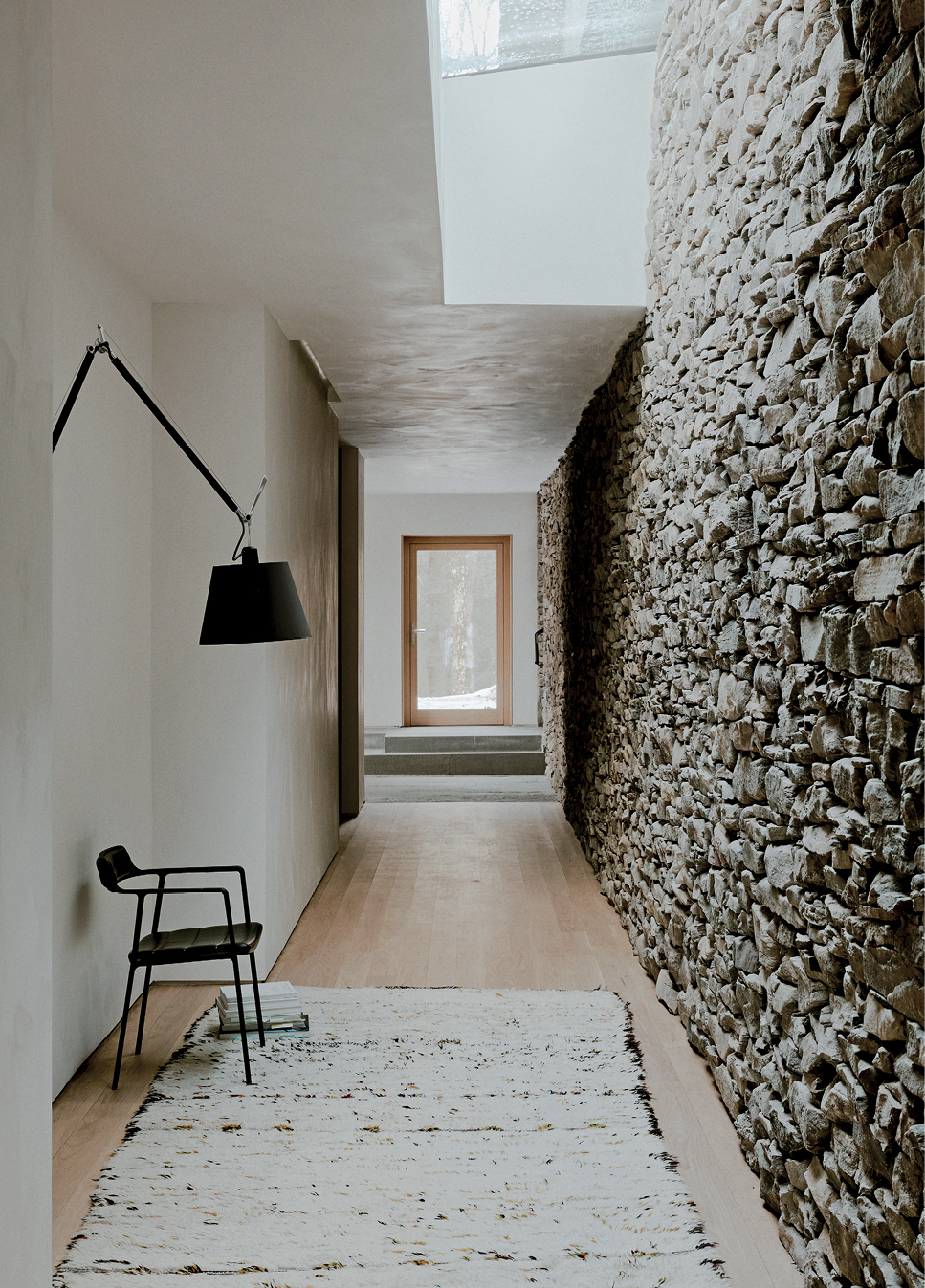 Ο επάνω όροφος είναι σχεδιασμένος για την ψυχαγωγία και την κοινωνική ζωή και στην πραγματικότητα λειτουργεί ως παρατηρητήριο με τη βοήθεια των μεγάλων γυάλινων πάνελ, απλώνοντας μπροστά του μια απρόσκοπτη θέα στη λίμνη. Οι γυάλινοι τοίχοι εδώ δημιουργούν μια αίσθηση αδιάσπαστης συνέχειας μεταξύ του εσωτερικού και του εξωτερικού. Ο χώρος που φιλοξενεί την κουζίνα, το καθιστικό και την τραπεζαρία, καθώς και μια υπαίθρια βεράντα ατενίζουν τη γειτονική λίμνη και τις γύρω πλαγιές. Ενώ οι απαλές υφές και η ζεστή παλέτα -από λευκή δρυ και σοβά- εξισορροπούν τα πιο «άγρια» υλικά της κατασκευής, το τοπίο επιτρέπεται να παραμείνει ο απόλυτος, αδιαμφισβήτητος πρωταγωνιστής.
