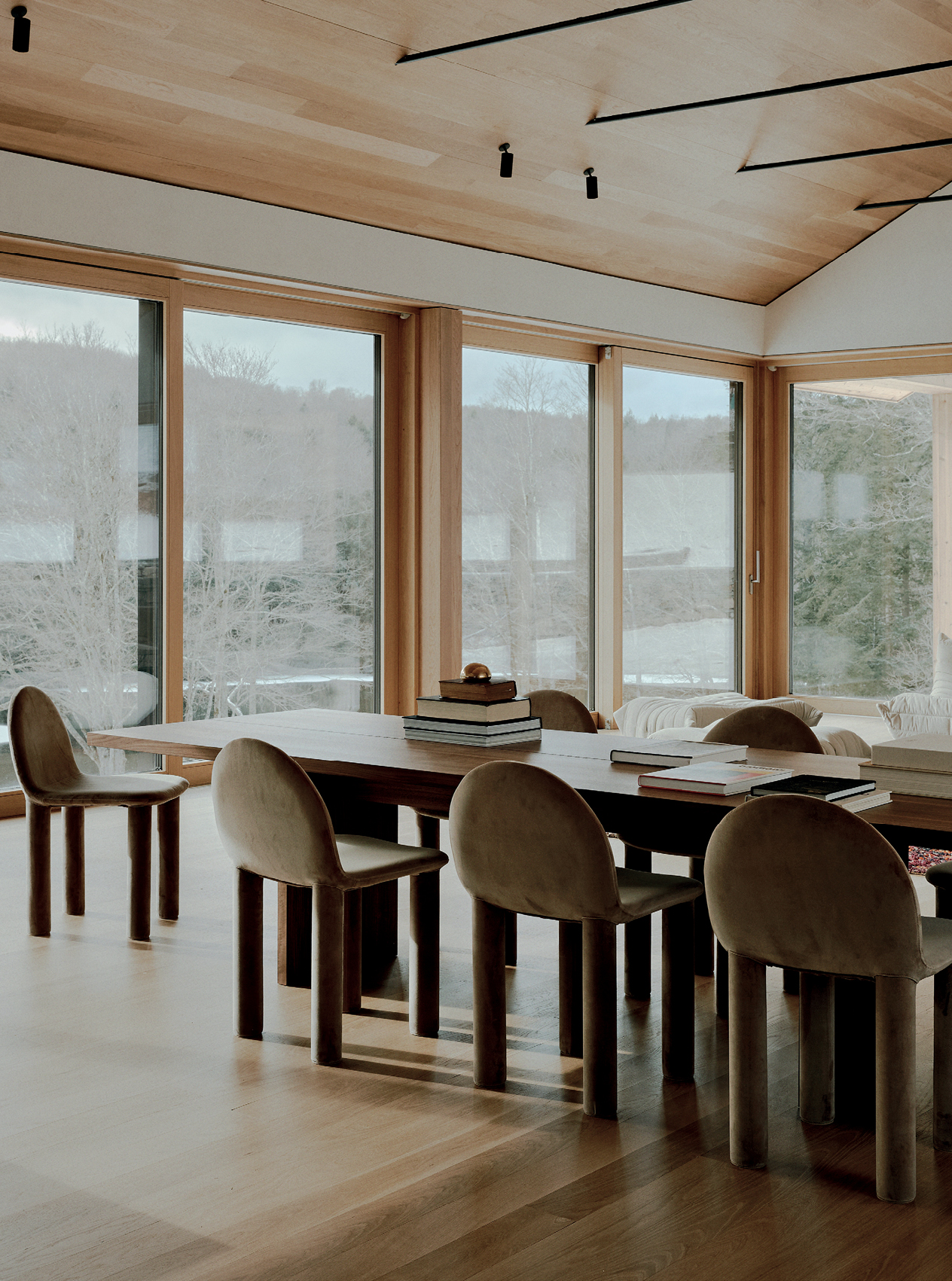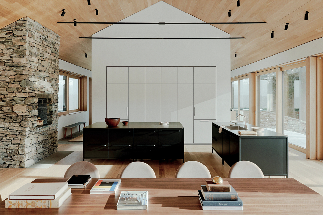 Ο επάνω όροφος είναι σχεδιασμένος για την ψυχαγωγία και την κοινωνική ζωή και στην πραγματικότητα λειτουργεί ως παρατηρητήριο με τη βοήθεια των μεγάλων γυάλινων πάνελ, απλώνοντας μπροστά του μια απρόσκοπτη θέα στη λίμνη. Οι γυάλινοι τοίχοι εδώ δημιουργούν μια αίσθηση αδιάσπαστης συνέχειας μεταξύ του εσωτερικού και του εξωτερικού. Ο χώρος που φιλοξενεί την κουζίνα, το καθιστικό και την τραπεζαρία, καθώς και μια υπαίθρια βεράντα ατενίζουν τη γειτονική λίμνη και τις γύρω πλαγιές. Ενώ οι απαλές υφές και η ζεστή παλέτα -από λευκή δρυ και σοβά- εξισορροπούν τα πιο «άγρια» υλικά της κατασκευής, το τοπίο επιτρέπεται να παραμείνει ο απόλυτος, αδιαμφισβήτητος πρωταγωνιστής.