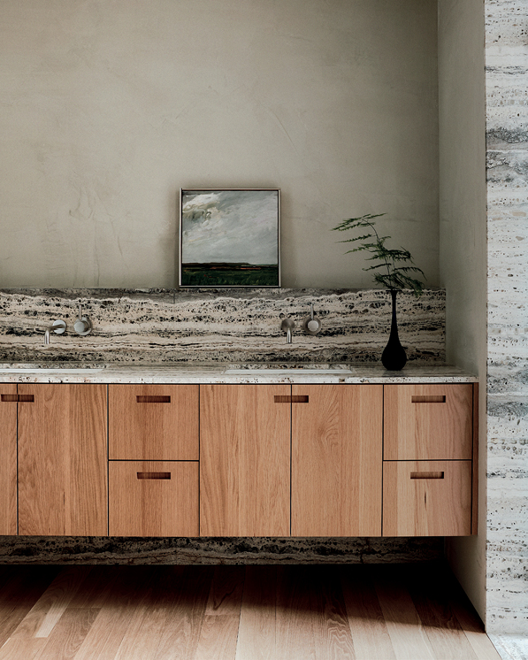 Η κατοικία αναπτύσσεται σε δύο αυτόνομους αλλά συνδεδεμένους όγκους, οι οποίοι είναι χτισμένοι πάνω στις γραμμές των υφιστάμενων ξερολιθιών. Αυτή η διάταξη στρέφει στρατηγικά το σπίτι προς μια σειρά από εκπληκτικές εικόνες του περιβάλλοντος, οι οποίες εισβάλλουν στο εσωτερικό μέσα από λειτουργικά γυάλινα πάνελ που εκτείνονται από το δάπεδο μέχρι την οροφή. Με το σπίτι τοποθετημένο στην πλαγιά, η οπτική εμπειρία ξεδιπλώνεται αρμονικά, καθοδηγούμενη από τις γραμμές των παλιών ξερολιθιών.