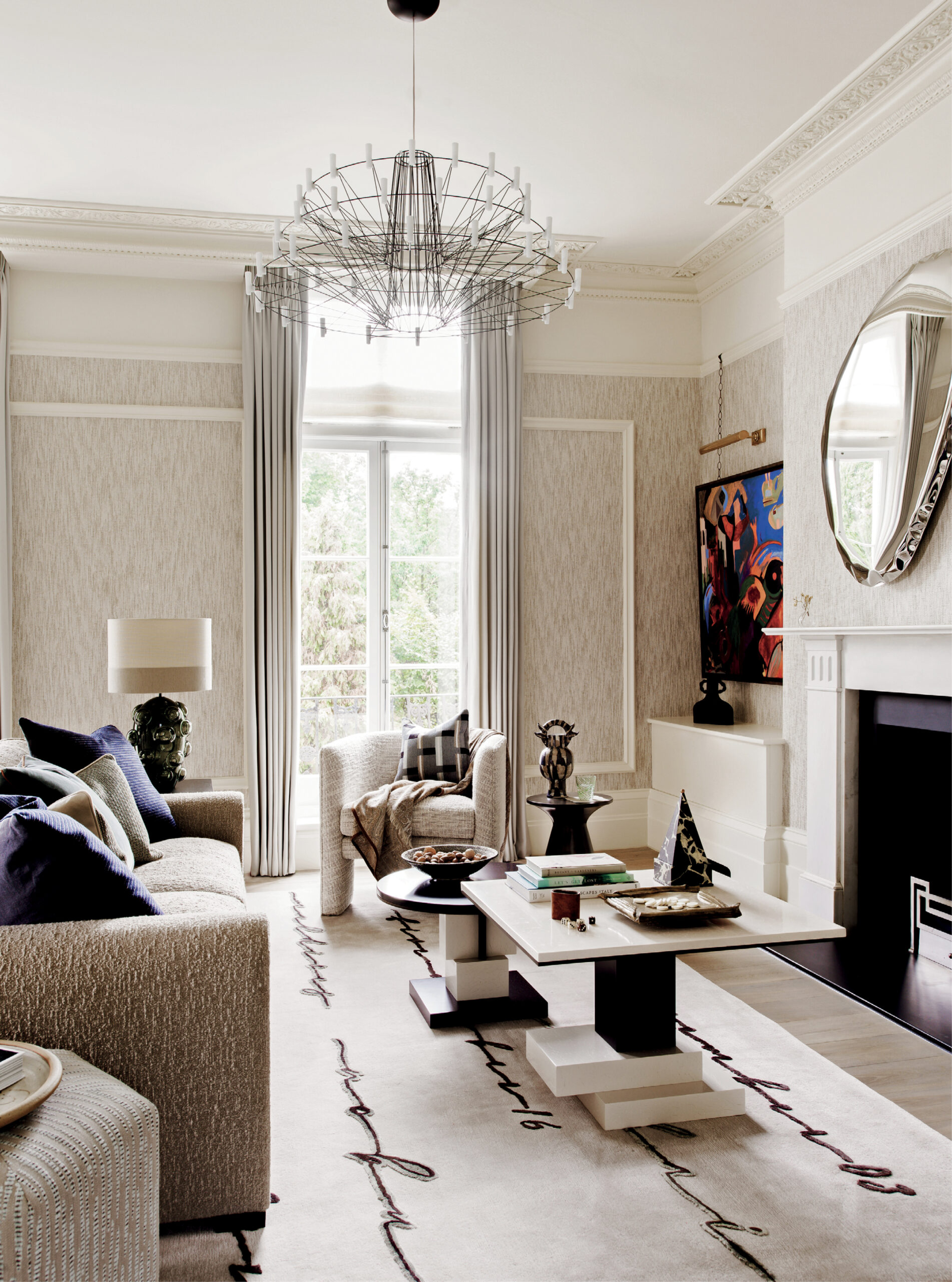 Στον πρώτο όροφο, το καθιστικό απλώνεται σε δύο αυτόνομες αλλά ευέλικτες ζώνες με καναπέδες τοποθετημένους πλάτη με πλάτη, που μπορούν να αναδιαταχθούν ανάλογα με τη διάθεση των ενοίκων. Οι πιο παραδοσιακές παρεμβάσεις, όπως η εισαγωγή ξύλινης επένδυσης εμπνευσμένης από τη Regency εποχή (αρχές του 1800), αποτελούν φόρο τιμής στην ιστορία του κτιρίου, ενώ οι πινελιές έντονου χρώματος -όπως το πράσινο γραφείο ή τα παιδικά δωμάτια- εισάγουν τη φρεσκάδα και τη ζωντάνια της σύγχρονης αισθητικής.
