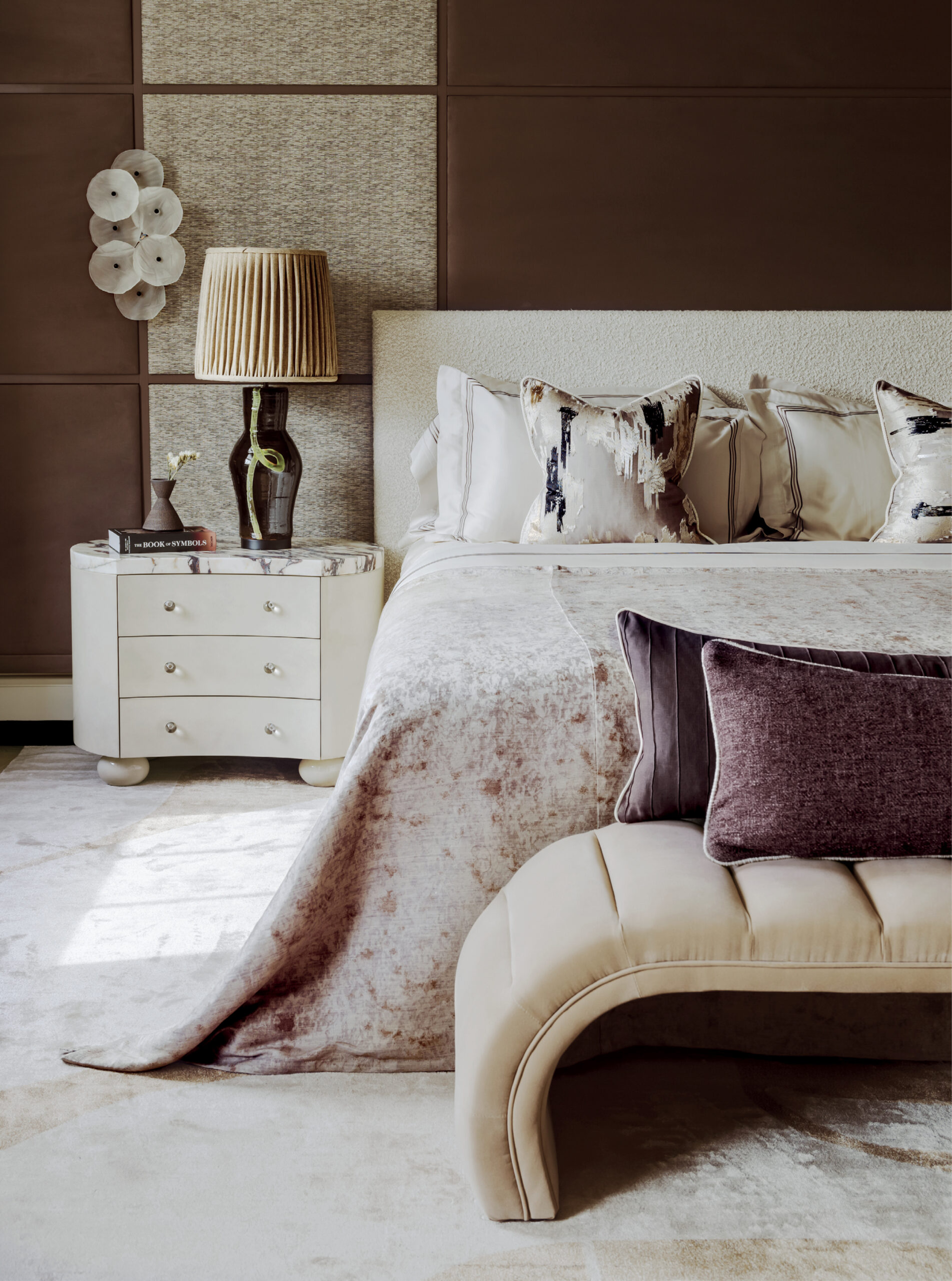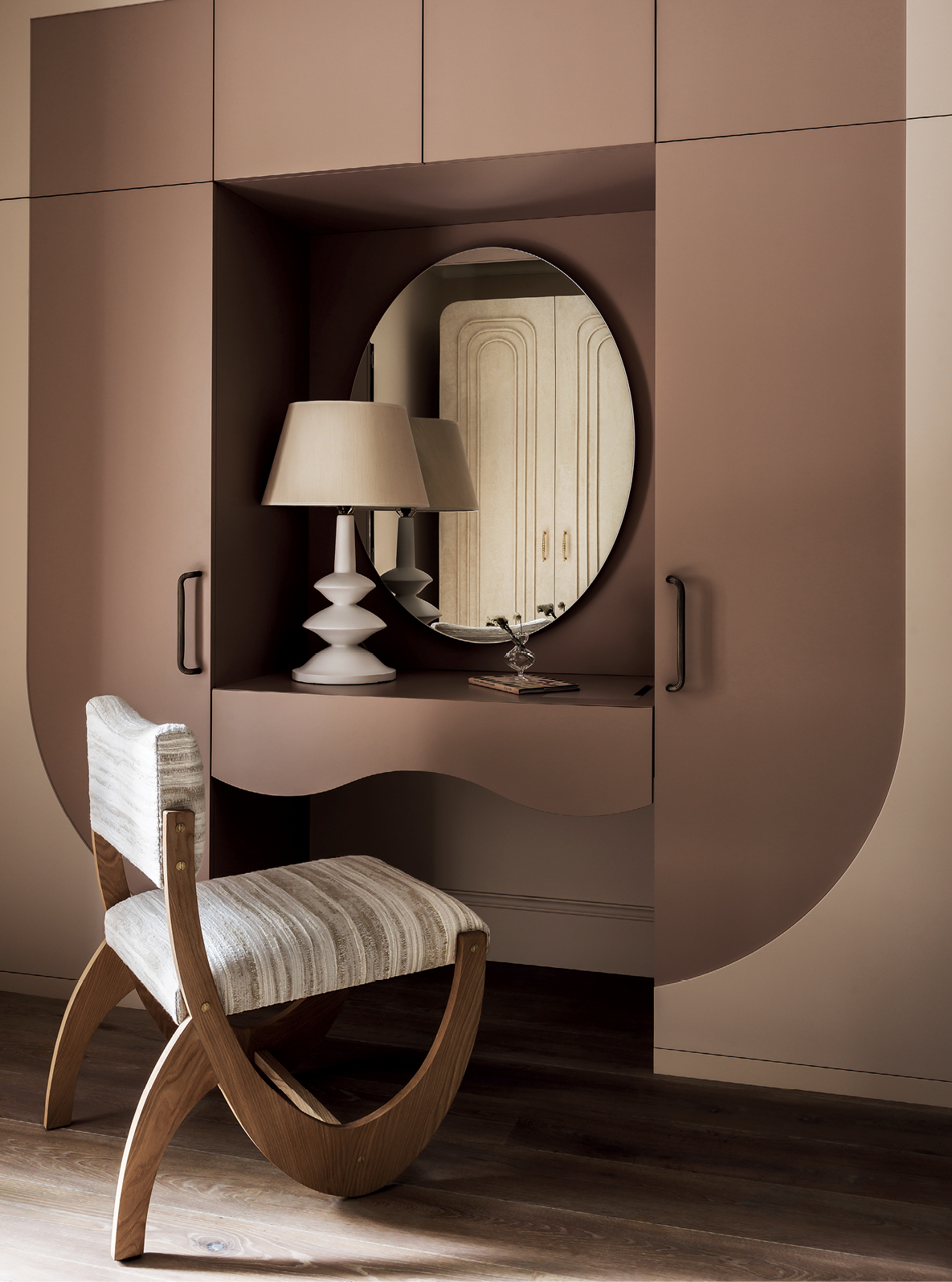 Το design λειτουργεί σαν γέφυρα ανάμεσα στους αιώνες. Η αυστηρότητα του νεοκλασικισμού εξισορροπείται από τις οργανικές καμπύλες επίπλων και φωτιστικών, δημιουργώντας μια αίσθηση ρευστότητας και ζεστασιάς. Η μοντέρνα λειτουργικότητα αποτυπώνεται σε τολμηρές λύσεις, όπως το υβριδικό γραφείο/μπαρ στο δωμάτιο μελέτης, ένας χώρος που μεταμορφώνεται εύκολα από playroom σε κομψό καθιστικό για χαλάρωση. Εκεί, η ενσωματωμένη καμπύλη επιφάνεια εργασίας συνυπάρχει με ψυγεία κρασιών και έναν ανασυρόμενο πάγκο για την προετοιμασία ποτών.