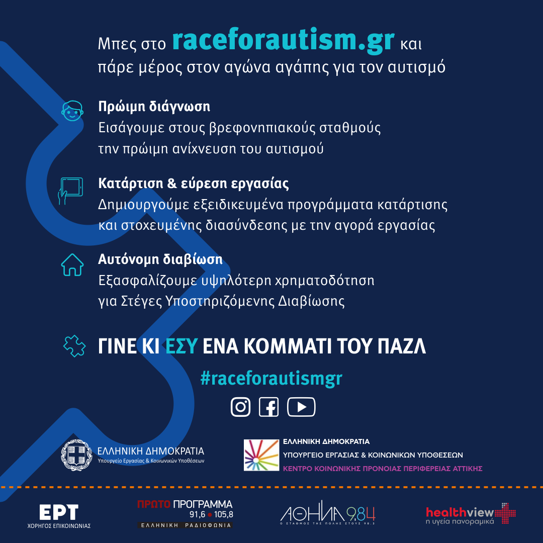 Με αφορμή την Παγκόσμια Ημέρα για τον Αυτισμό στις 2 Απριλίου, το Κέντρο Κοινωνικής Πρόνοιας Περιφέρειας Αττικής σε συνεργασία με το Υπουργείο Εργασίας και Κοινωνικών Υποθέσεων, διοργανώνουν τον διαδικτυακό αγώνα Race for Autism (#raceforautismgr).