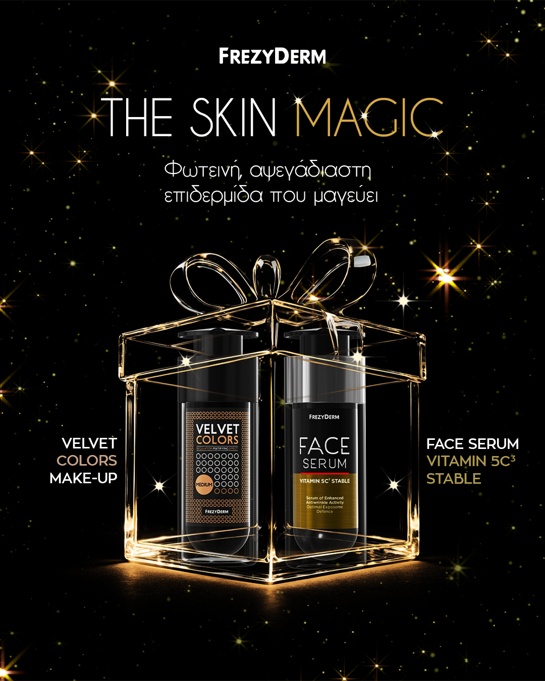 Αυτές τις μέρες όμως θέλουμε το πιο φωτεινό και άψογο δέρμα all day long. Το μαγικό combo της Frezyderm, Face Serum Vitamin 5C³ Stable και Velvet Colors, χαρίζει άμεσα και ορατά λαμπερό δέρμα και ομοιόμορφο, άψογο τόνο για magic skin τις γιορτές.