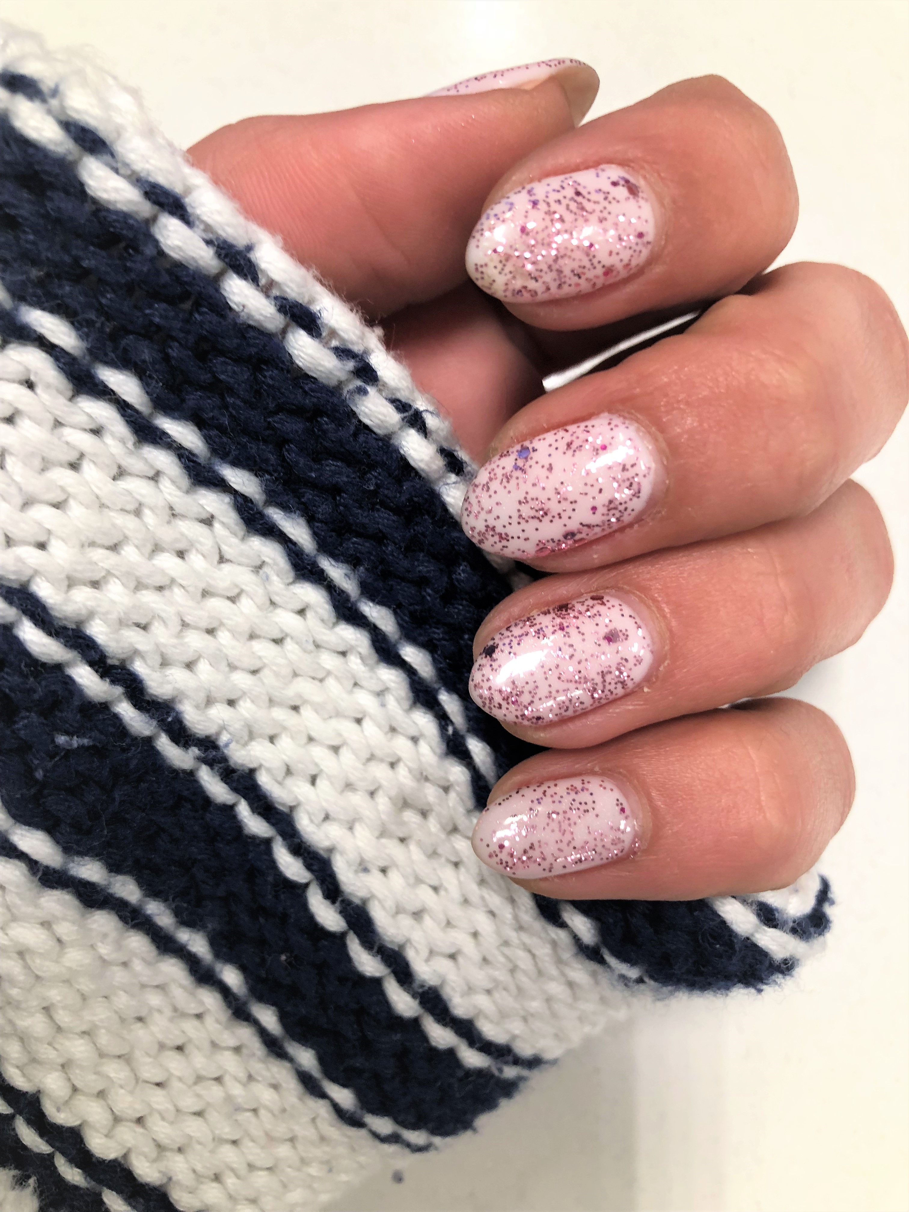 Η βάση είναι παστέλ ροζ, ενώ το διάφανο ροζ βερνίκι με glitter δίνει το πιο girly, pre x-mas mood!
