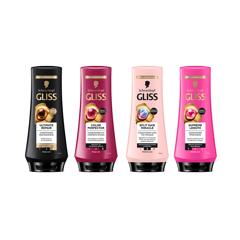 Επιπλέον, σε πρώτη εφαρμογή στην αγορά retail, το Gliss ενσωμάτωσε σε όλες τις συσκευασίες των προϊόντων του δείκτη περιποίησης τριών επιπέδων, για να βρίσκουμε εύκολα εκείνο που μας ταιριάζει και καλύπτει καλύτερα τις ανάγκες του τύπου των μαλλιών μας.