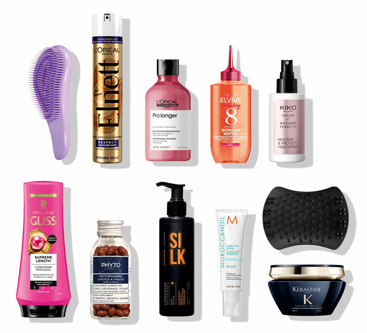 1. Βούρτσα για εύκολο ξεμπέρδεμα των μαλλιών, Lavender Hair Detangling Brush, Azadé (Hondos Center) 2. Λακ για ανάλαφρο κράτημα και προστασία, Elnett Respect Damaged Hair, L’Oréal Paris 3. Σαμπουάν κατά της ψαλίδας στα μακριά μαλλιά, Serie Expert Pro Longer Shampoo, L’Oréal Professionnel 4. Υγρό conditioner για μακριά μαλλιά, Elvive Dream Long Wonder Water, L’Oréal Paris 5. Θερμοπροστατευτικό σπρέι μαλλιών, Nourish & Protect Hair Spray, Kiko Milano 6. Conditioner προστασίας για μακριά μαλλιά, Gliss Supreme Length Conditioner, Schwarzkopf 7. Συμπλήρωμα διατροφής για δύναμη, ανάπτυξη και όγκο στα μαλλιά, Phytophanere, Phyto 8. Κρέμα styling που προστατεύει από τη θερμότητα, Silk Repair & Shine Balm, Lorvenn 9. Απαλό scrub απολέπισης για το τριχωτό της κεφαλής, Scalp Purifying Scrub, Moroccanoil 10. Βούρτσα για μασάζ και απολέπιση του τριχωτού, Scalp & Shampoo Brush, Tangle Teezer (Hondos Center) 11. Μάσκα εντατικής θρέψης, Chronologiste Masque Intense Régénérant, Kérastase