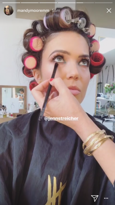 Η Mandy Moore με ρόλει στα μαλλιά για τέλειο όγκο και η make up artist της να της κάνει smudging στα μάτια!