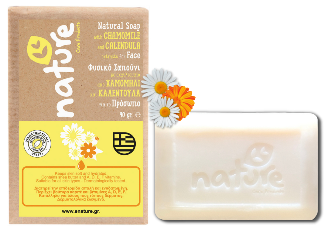 Το νέο φυσικό-φυτικό σαπούνι NATURE, με εκχυλίσματα χαμομηλιού και καλέντουλας, είναι κατάλληλο για τον καθαρισμό του προσώπου. Η ειδική σύνθεσή του με φυσικά εκχυλίσματα και βιταμίνες, χαρίζει βαθιά ενυδάτωση, ενισχύει τη φυσική διαδικασία ανάπλασης του δέρματος και βελτιώνει την ελαστικότητά του. Το εκχύλισμα χαμομηλιού έχει εξαιρετική αντιφλεγμονώδη και αντισηπτική δράση βοηθώντας έτσι σημαντικά στη καταπράυνση των ερεθισμένων ιστών του δέρματος. Το εκχύλισμα ανθών καλέντουλας έχει απαλυντική δράση, ενισχύοντας την ανανέωση του δέρματος. Το βούτυρο καριτέ και οι βιταμίνες Α, D, Ε, F που περιέχει, περιποιείται και βελτιώνει την υφή της επιδερμίδας, αφήνοντάς την εξαιρετικά λεία και απαλή. Το νέο φυσικό-φυτικό σαπούνι προσώπου με σύνθεση πλούσια σε βιταμίνες και εκχυλίσματα χαμομηλιού και καλέντουλας, είναι το νέο σας καλλυντικό που θα εντάξετε στην καθημερινή περιποίηση της επιδερμίδας σας πρωί-βράδυ. Είναι κατάλληλο για όλους τους τύπους δέρματος και είναι δερματολογικά ελεγμένο.